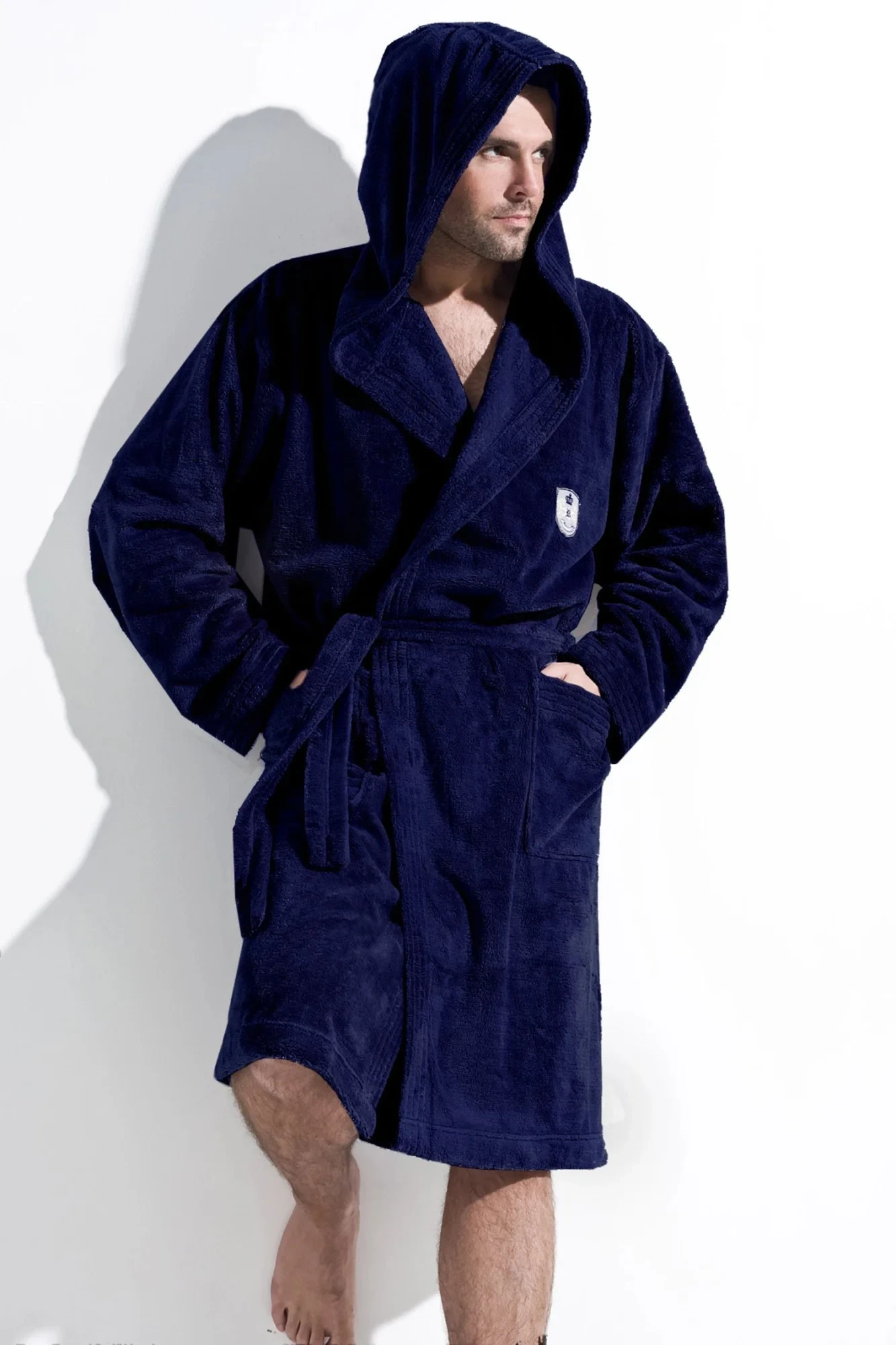 Pánský župan Iwo dark blue L&L - tmavě modrá barva - z měkkého materiálu typu soft - s krátkým hustým vlasem po obou stranách - ozdobná výšivka na levé straně - po stranách jsou našité kapsy - zavazování na pásek - s kapucíMateriálové složení: 100% polyester