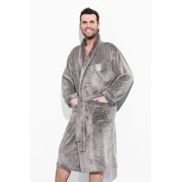 Klasický pánský župan. Příjemný měkký úplet, šálový límec lemovaný lemováním v kontrastní barvě. Ozdobná výšivka na hrudi, zavazování v pase, pohodlné kapsy na bocích.