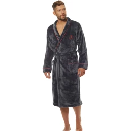 Krásný hřejivý župan s límcem a vázáním v pase. Župan má na hrudníku výšivku, která dodává luxusnímu vzhledu. Ideální doplněk pro chladné zimní večery.
