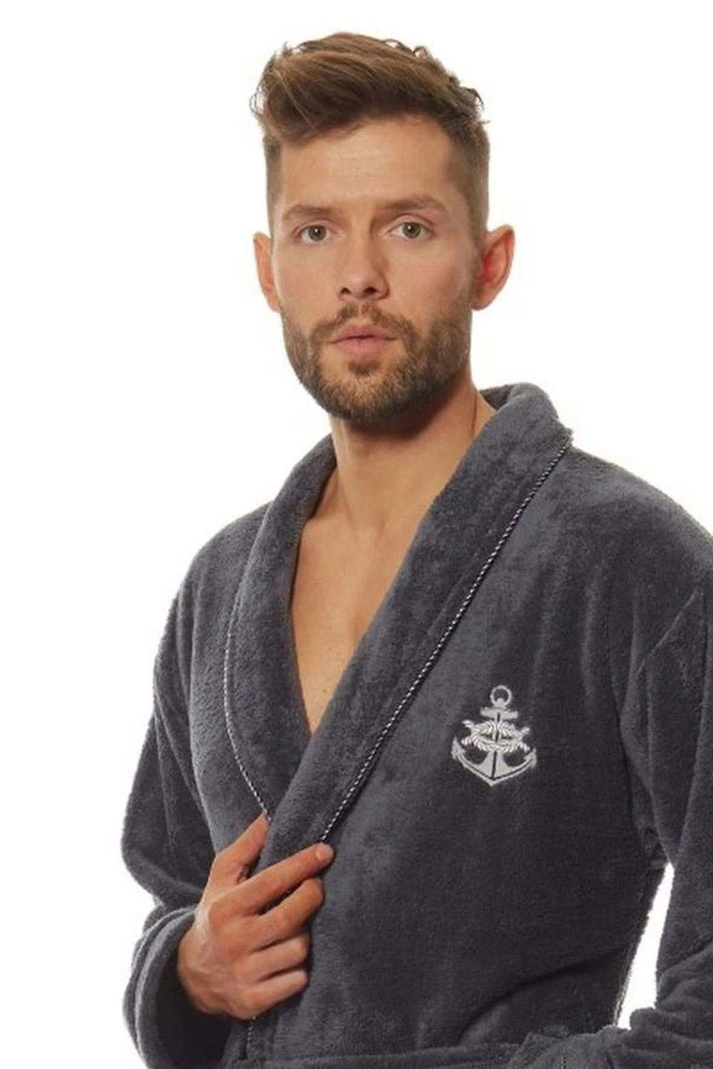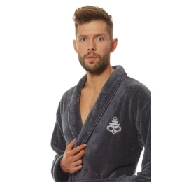 Pánský župan klasického střihu 2114 Marine L&L - z měkké tkaniny velmi příjemné na dotyk - v grafitové barvě - na hrudi má malou nášivku - zavazuje se v pase páskem - na bocích jsou našité kapsy - s šálovým límcem