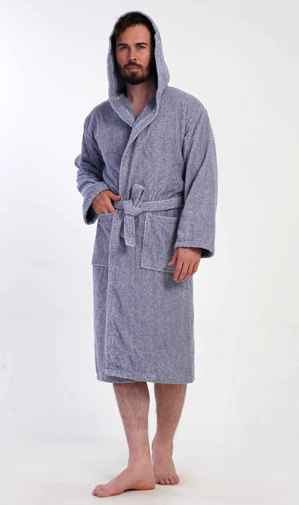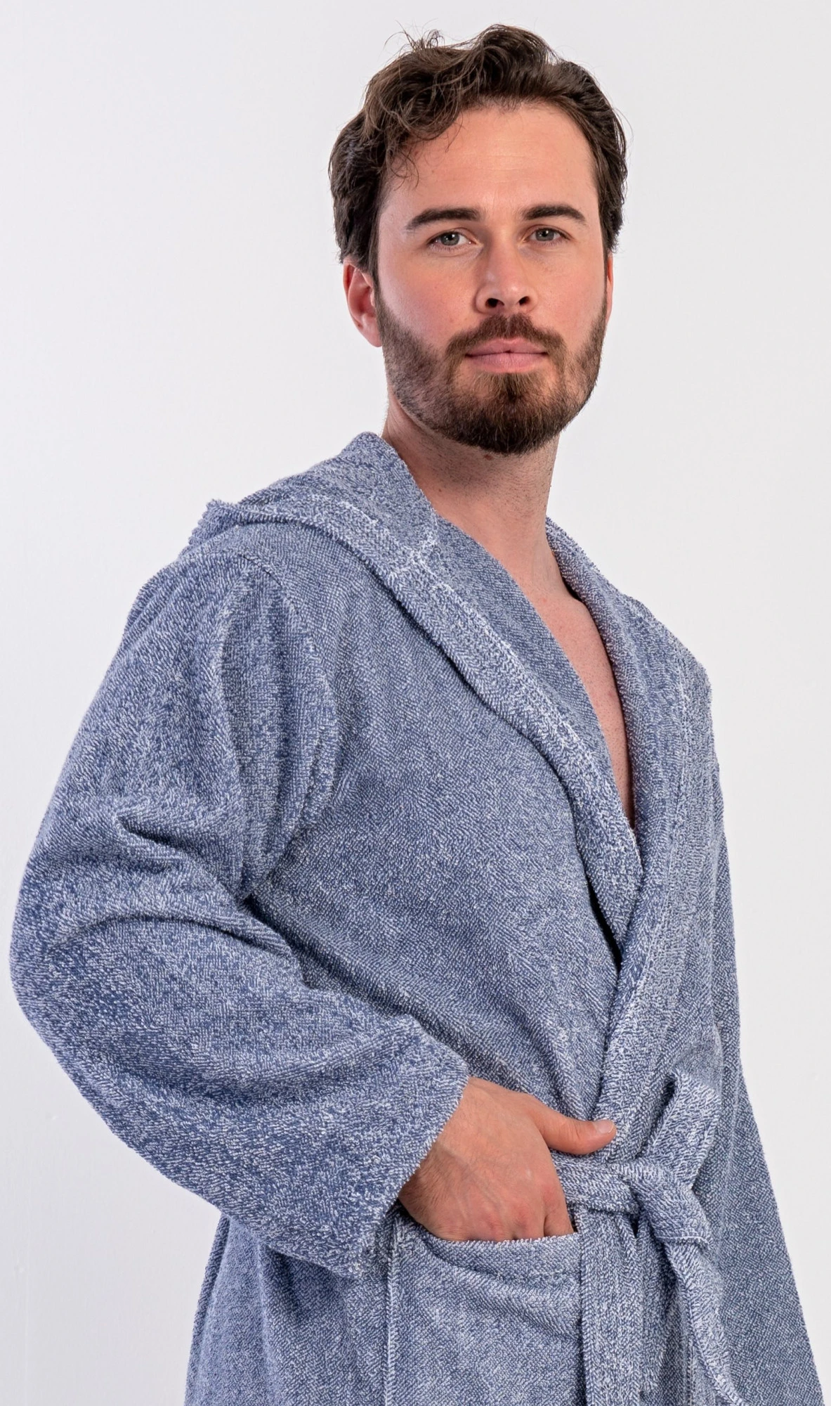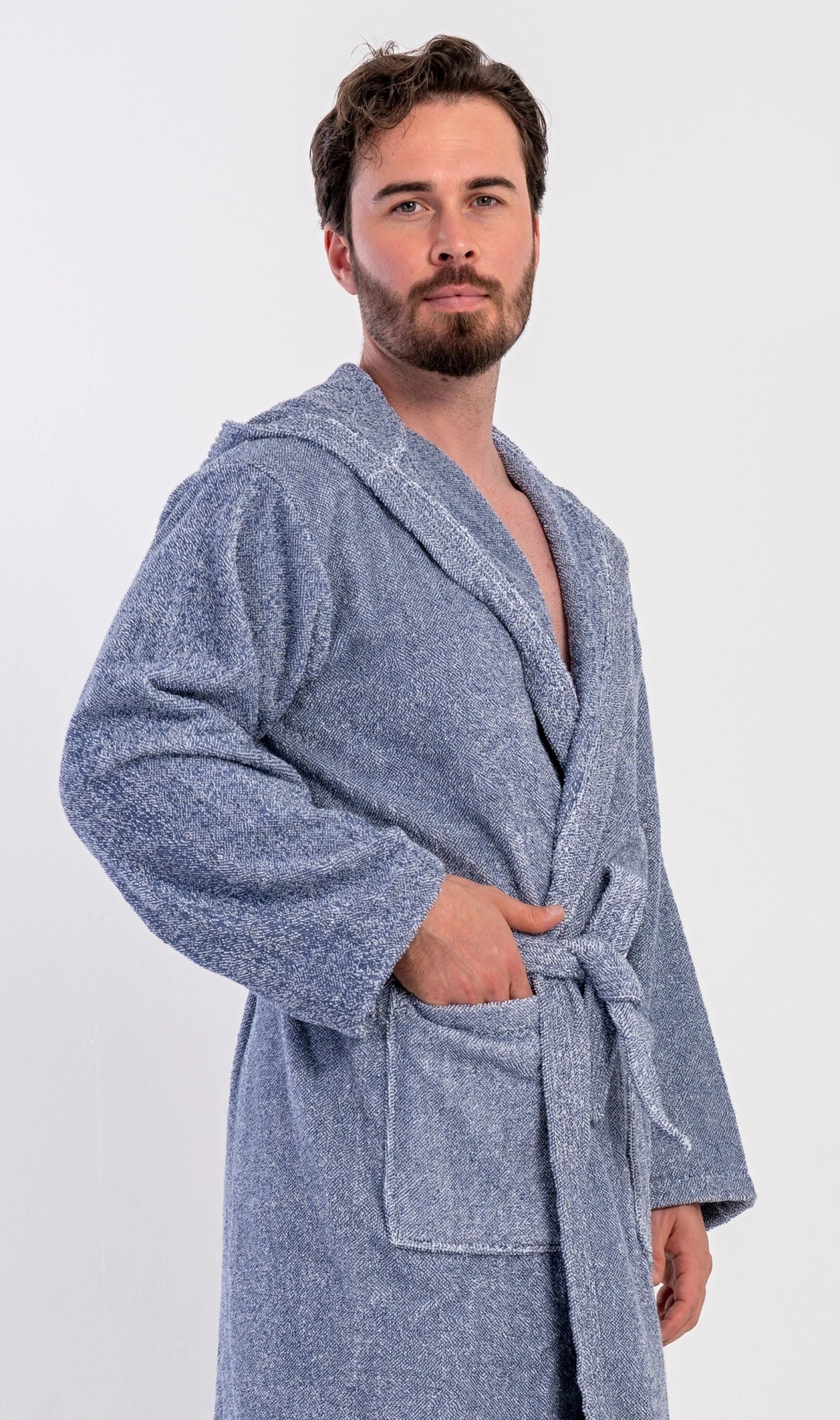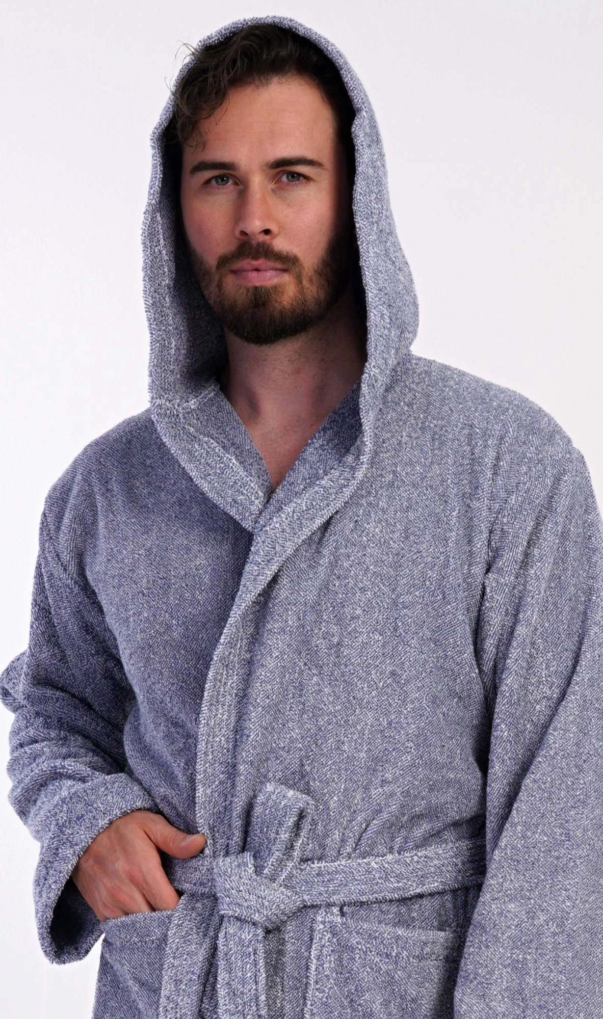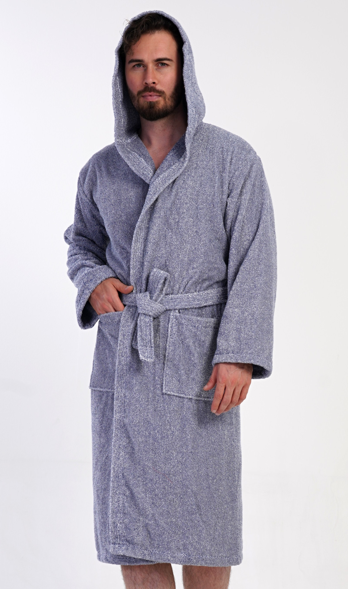 Pánský bavlněný froté župan s kapucí Luis. Pánský dlouhý župan s kapucí a páskem ke stažení je vhodný po koupeli i na povalování se doma na gauči. Froté župan má praktické kapsy, které oceníte při návštěvě wellness. Použitý bavlněný materiál je příjemný a poddajný na dotek.