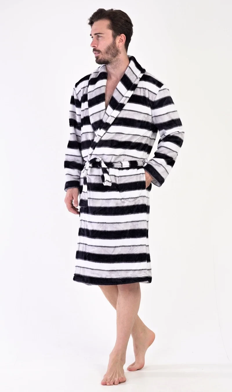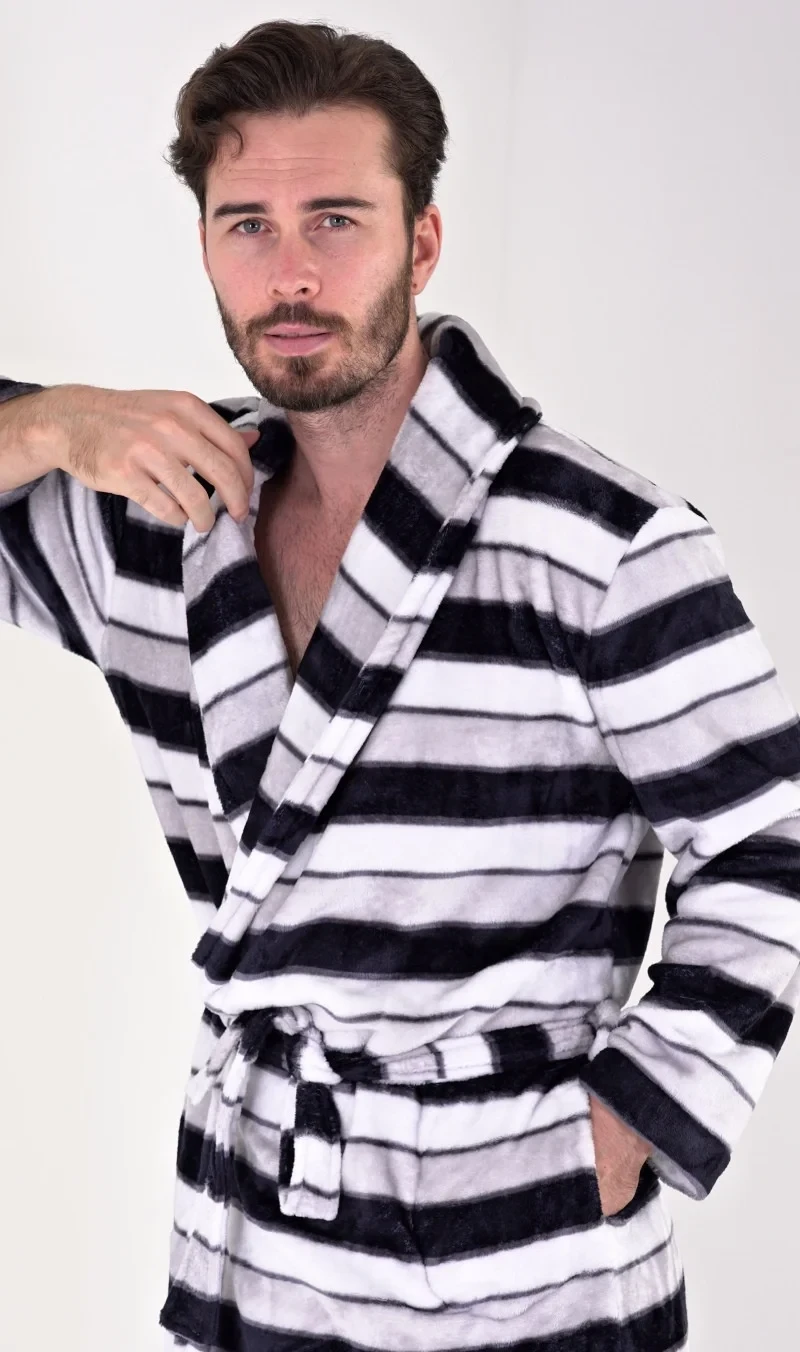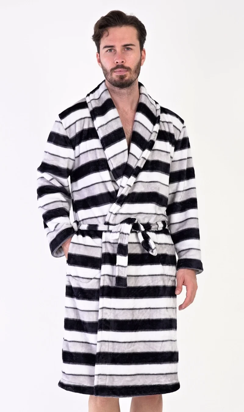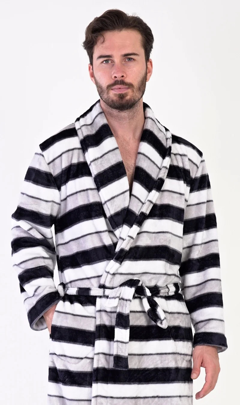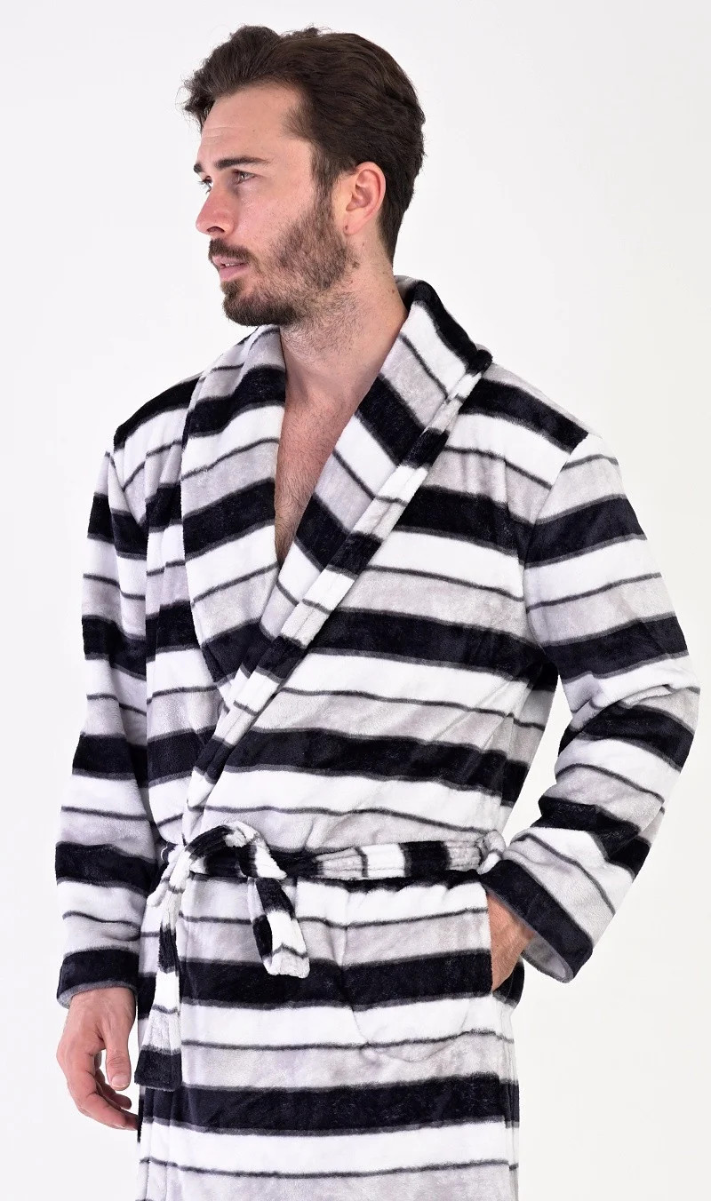 Pánský softový župan se šálovým límcem William. Župan má šálový límec, praktické kapsy a pásek ke stažení. Je zdobený pruhy v různých odstínech šedé. Použitý softový materiál je jemný a poddajný na dotek. Župan Vás zahřeje cestou z koupelny i při lenošení na gauči, bude to Váš milý společník v chladných dnech.