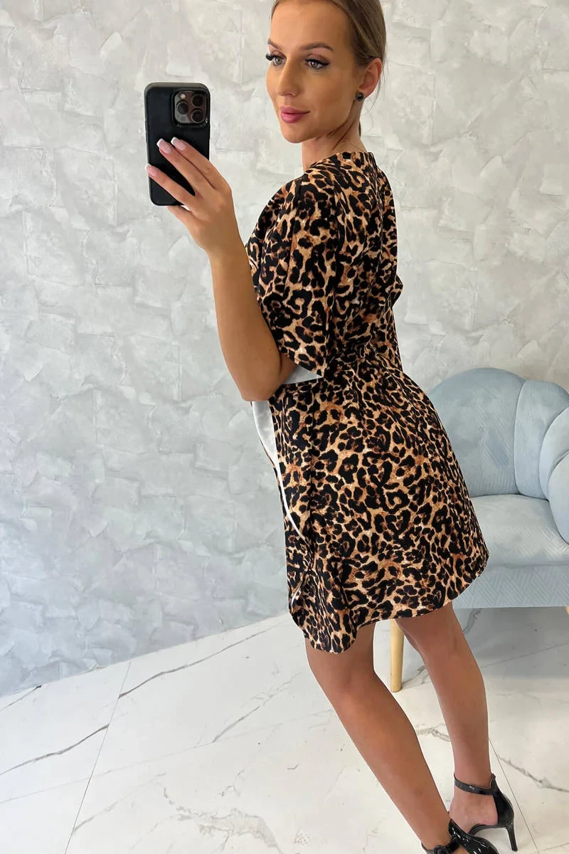 Představujeme vám módní šaty. Šaty mají netopýří rukávy. Módní leopardí potisk. Šaty zavázané v pase. Ideální každodenní poloha. Šaty jsou vyrobeny z vysoce kvalitního materiálu. Velikost je univerzální a vyhovuje dámám, které nosí velikost S, M nebo L.