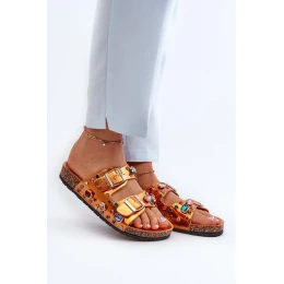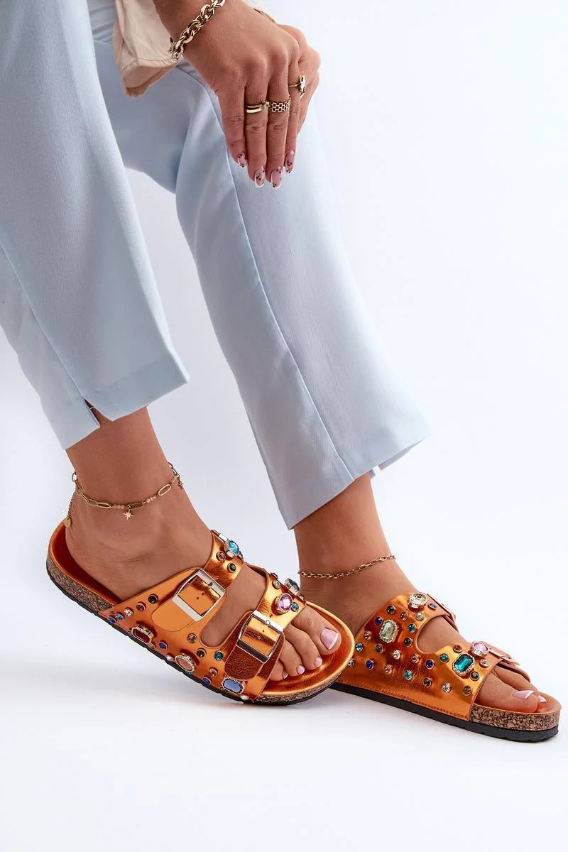 Žabky značky S.Barski vyrobené z ekokože. Ozdobené třpytivými kameny, dodávají lesku každému outfitu. Na korkové platformě poskytují stabilitu a módní vzhled. Vepředu jsou dva nastavitelné popruhy s přezkami, které zajišťují perfektní přizpůsobení noze. Tyto boty nejen přitahují pozornost svým jedinečným designem, ale také poskytují pohodlí při nošení.
