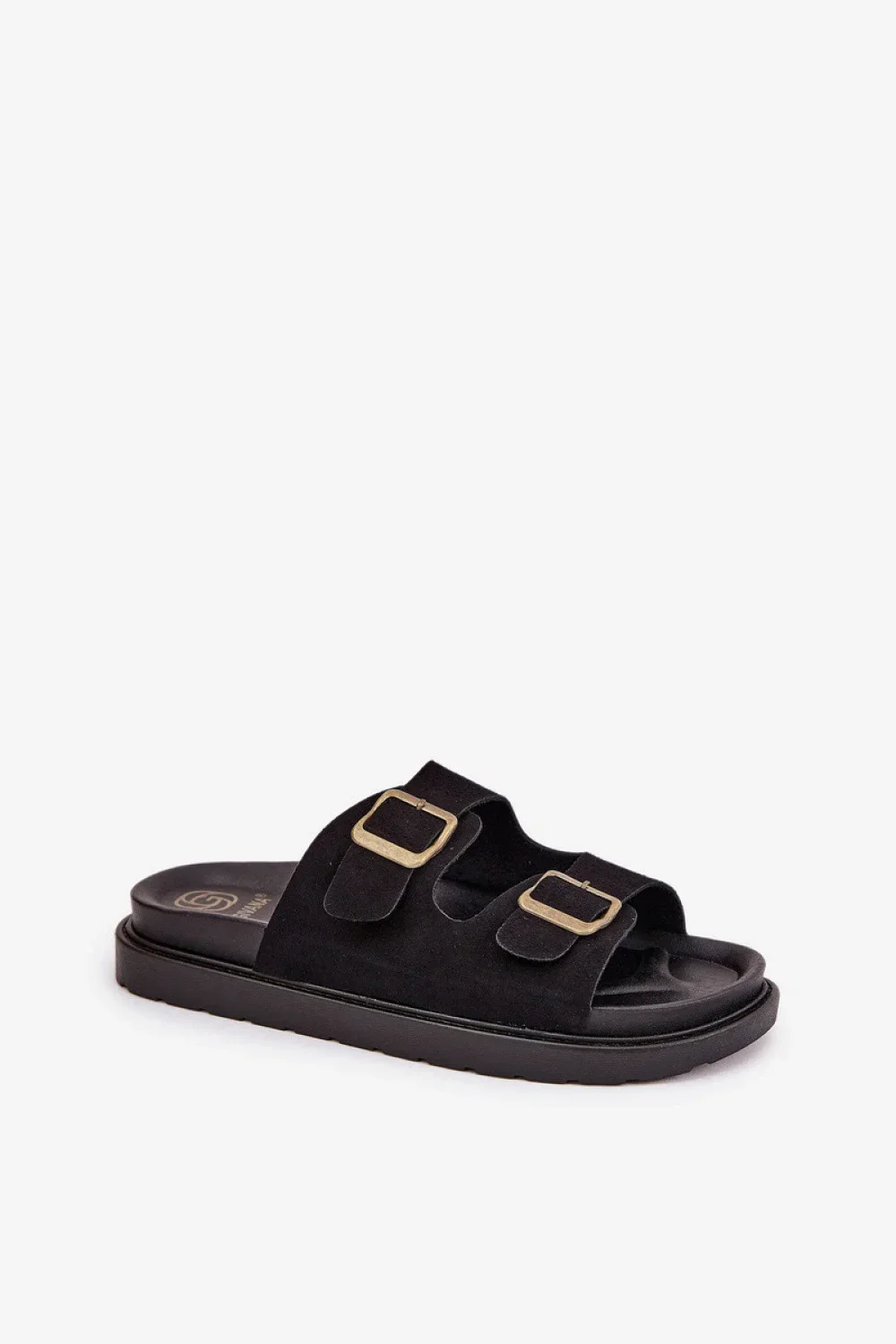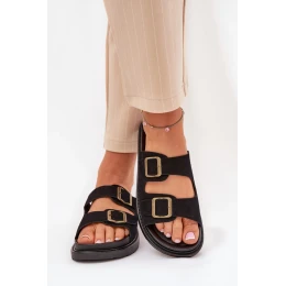 Stylové pantofle vyrobené z ekosuede. Umístěné na platformě, která kombinuje pohodlí s módním vzhledem. Pásky s přezkami zajišťují ideální přizpůsobení a profilovaná stélka zaručuje pohodlí po celý den. Tyto pantofle budou skvělou volbou na letní dny, hodí se jak k šatům, tak k kalhotám.