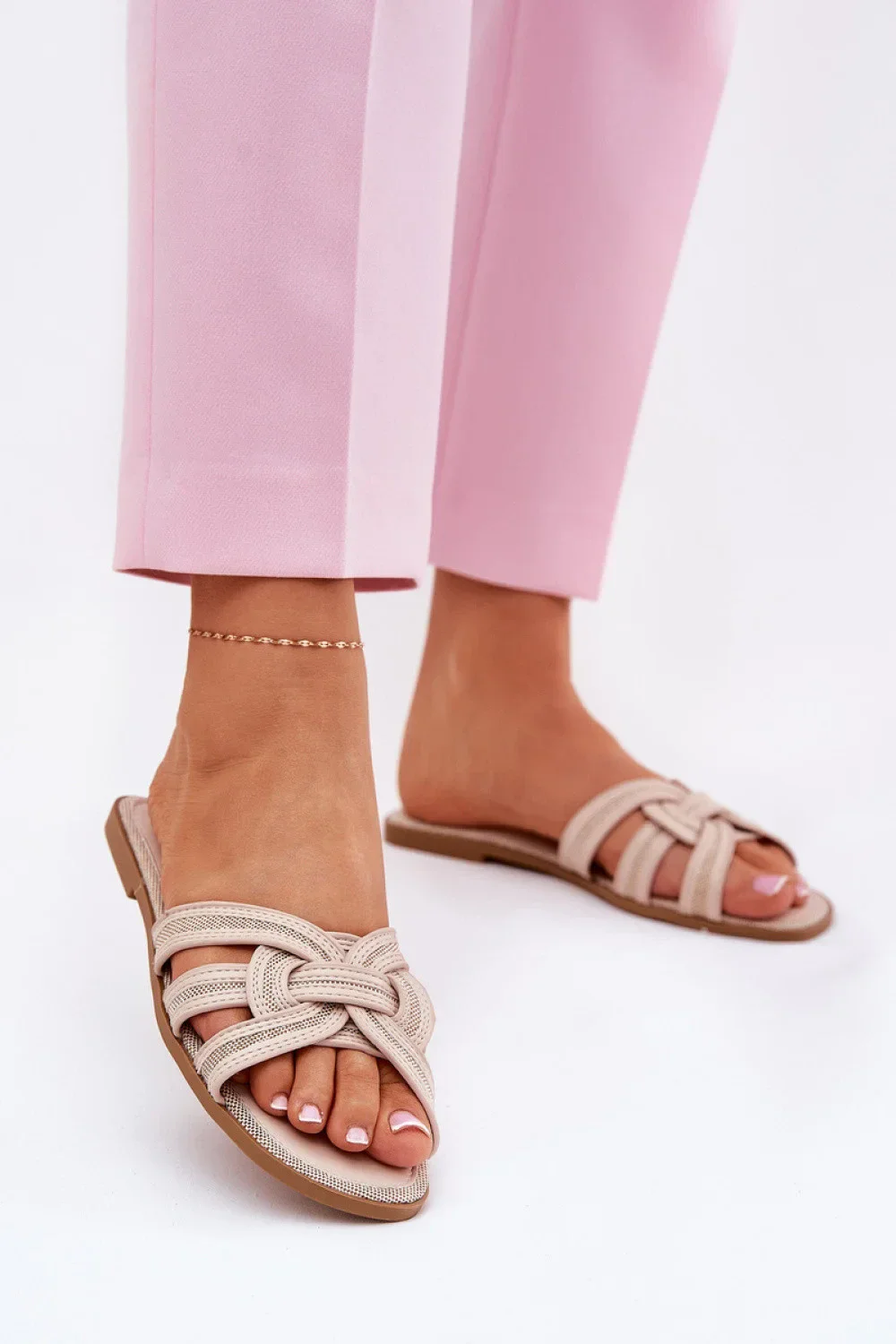Klasické ploché dámské sandály vyrobené z kombinace ekokože a textilního materiálu, které spojují pohodlí s decentním stylem. Propletené popruhy přední části dodávají sandálům lehký, moderní charakter. Ideální pro mnoho letních stylizací, tyto sandály budou ladit jak s šaty, tak s kalhotami nebo šortkami.