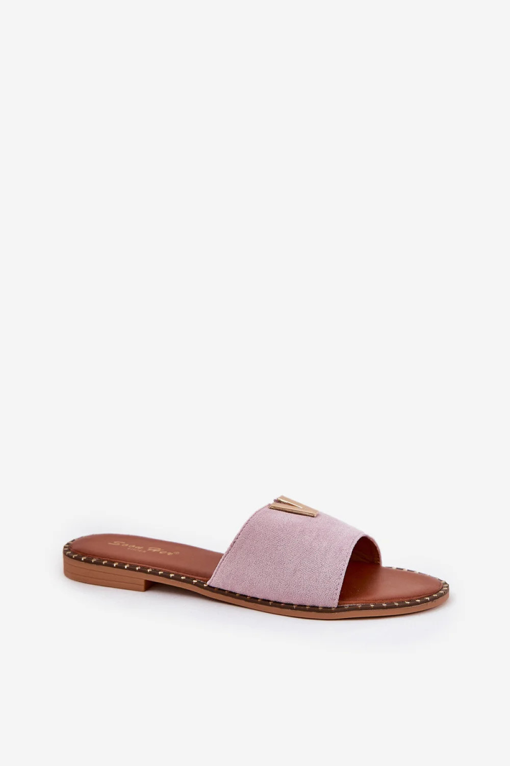 Dámské sandály na ploché podrážce jsou ideální volbou na letní dny. Vyrobené z příjemného na dotek eko semiše, zajistí pohodlí při nošení. Klasický střih byl obohacen o dekorativní detaily, které jim dodávají elegantní charakter. Skvěle se hodí jak na každý den, tak na letní procházky. Skvěle ladí s šaty, sukněmi a kalhotami, dodávají stylizaci stylový akcent.