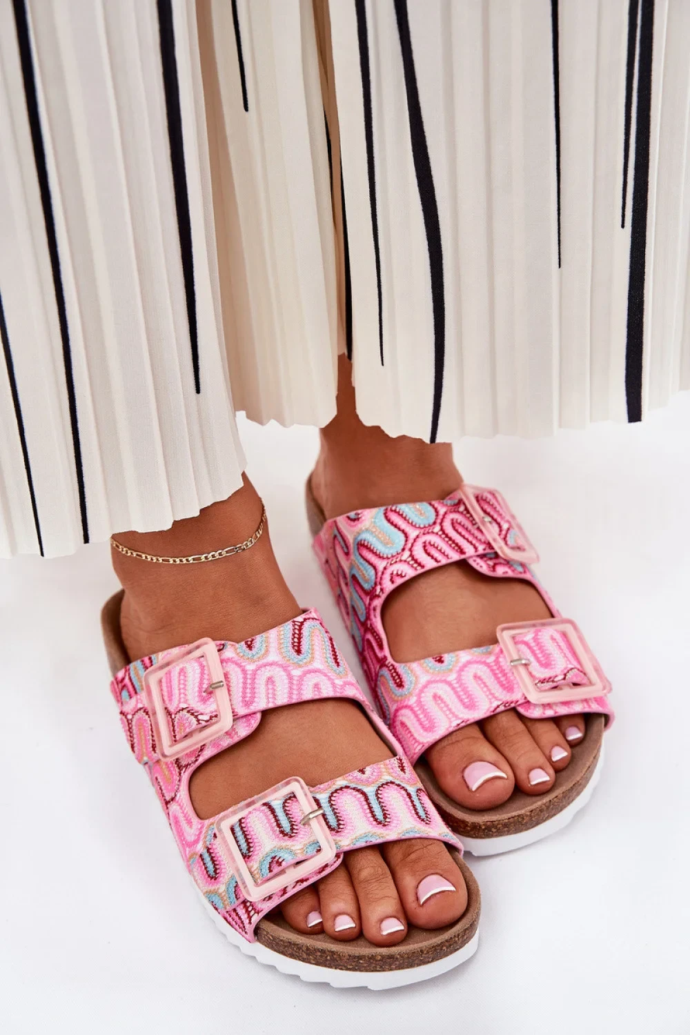 Vzorované dámské žabky z textilního materiálu, umístěné na korkové platformě, které spojují pohodlí s módním vzhledem. Dva popruhy s přezkami zdobenými flitry jim dodávají výjimečný charakter. Profilovaná semišová stélka zaručuje pohodlí po celý den. Tyto žabky budou skvělou volbou na letní dny, skvěle ladící s šaty, sukněmi nebo šortkami, vnášejíc do každého outfitu lehkost a lesk.