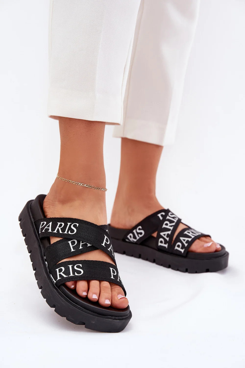 Dámské sandály na platformě s látkovými pásky s nápisem "PARIS" jsou stylovou volbou na teplé dny. Jejich unikátní vzhled kombinuje pohodlí s módním akcentem, dodávající každému outfitu charakter. Skvěle se hodí k casual a dovolenkovým outfitem, poskytují pohodlí a moderní vzhled.