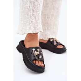Dámské pantofle z pěnového materiálu umístěné na platformě jsou stylovou volbou pro teplé dny. Zlaté, roztomilé ozdoby na pásku jim dodávají moderní charakter. Ideální na dovolenou, dny strávené u bazénu nebo na pláži.