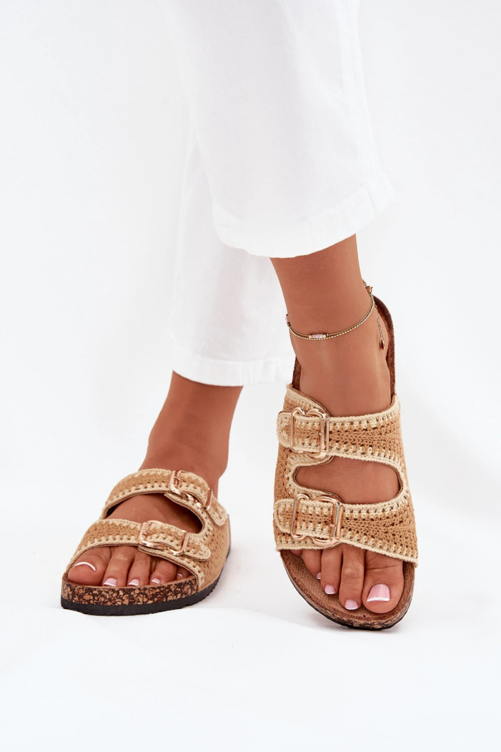 Háčkované ženské pantofle na korkové platformě jsou výjimečnou nabídkou pro teplé dny. Díky tvarované stélce z ekokože poskytují pohodlí a pohodlí po celý den. Dvě zlaté spony jim dodávají elegantní charakter. Ideální pro letní stylizace, tyto pantofle budou skvělou volbou k šatům, sukním a kalhotám.