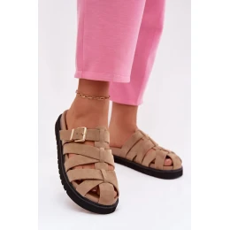 Stylové dámské sandály z ekokože jsou módním a pohodlným návrhem na teplé dny. Model umístěný na platformě jemně zdůrazňuje postavu a poskytuje pohodlí nošení. Pásky ozdobené zlatou přezkou dodávají celku elegantní charakter a tvoří efektní akcent. Tyto sandály se skvěle hodí jak do každodenních, tak do stylizovaných letních outfitů.