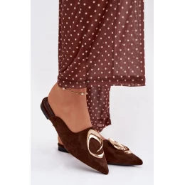 Dámské mule pantofle vyrobené z ekologického semiše jsou stylovým návrhem s elegantním charakterem. Zakryté, špičaté špičky dodávají modelu klasický tvar a velký zlatý detail vpředu je efektním akcentem přitahujícím pozornost. Plochý podpatek zajistí pohodlí nošení. Model skvěle doplní jak elegantní, tak volné outfit.