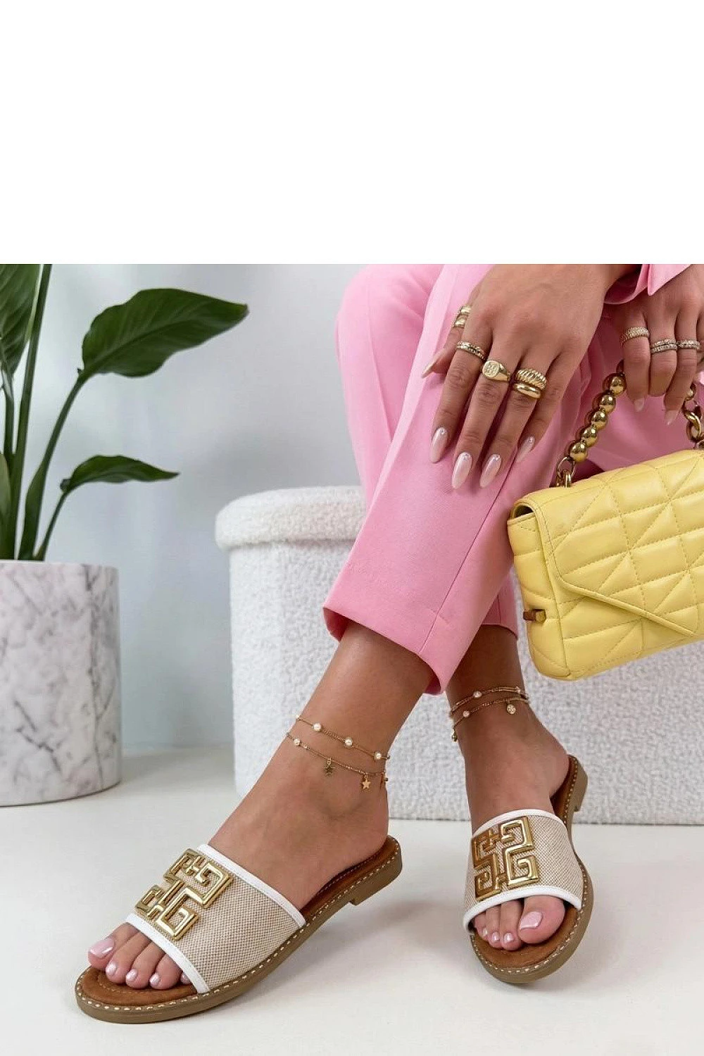 Elegantní pantofle s kovovým doplňkem vpředu jsou nabídkou pro ženy, které oceňují spojení pohodlí a stylového vzhledu. Vyrobené z vysoce kvalitního materiálu jsou lehké a pohodlné při každodenním nošení. Nízký podpatek o výšce 1,5 cm jemně zvedá postavu, poskytující stabilitu a pohodlí při chůzi. Zasouvací konstrukce usnadňuje rychlé obutí a dokonale se přizpůsobuje noze. Kovový doplněk vpředu přidává pantoflím eleganci a moderní charakter, činí je univerzální volbou jak na každý den, tak i na více neformální výlety.