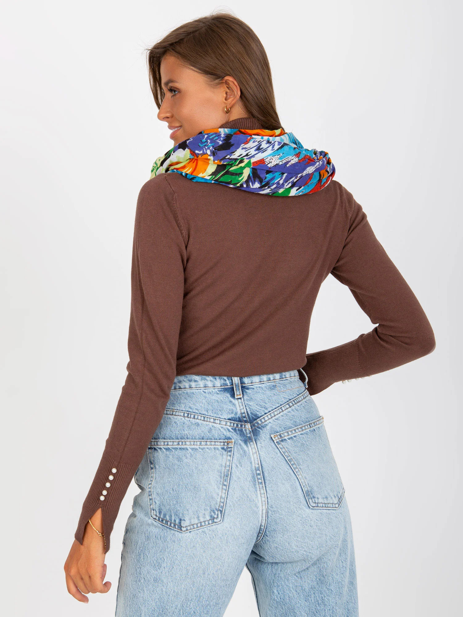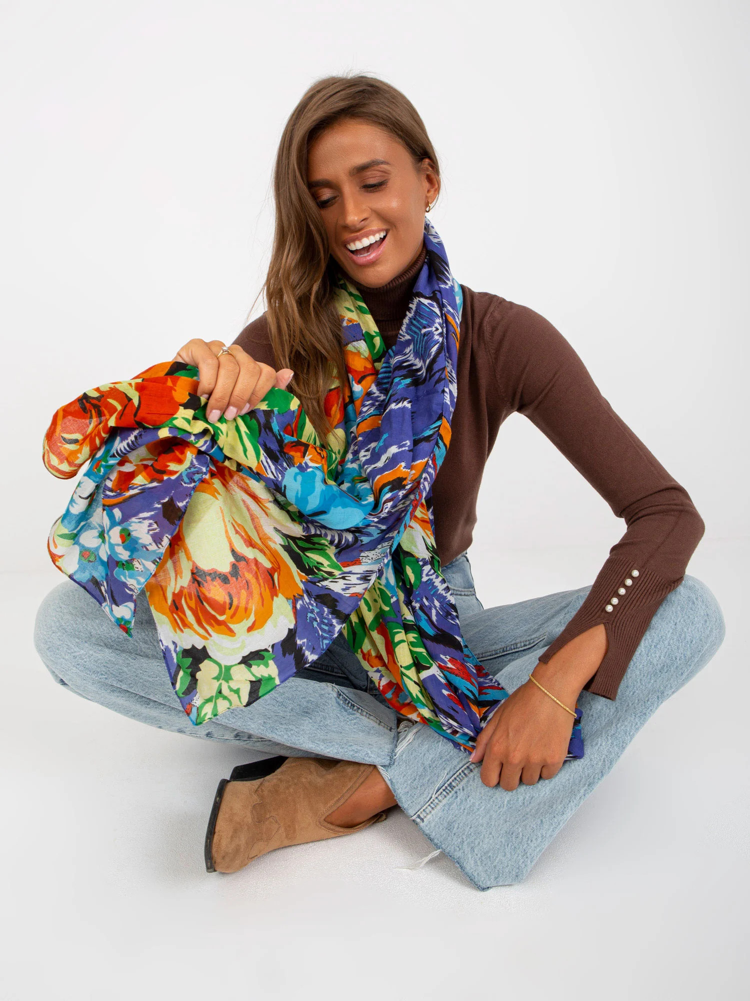 Modrý a oranžový šátek s potiskem .