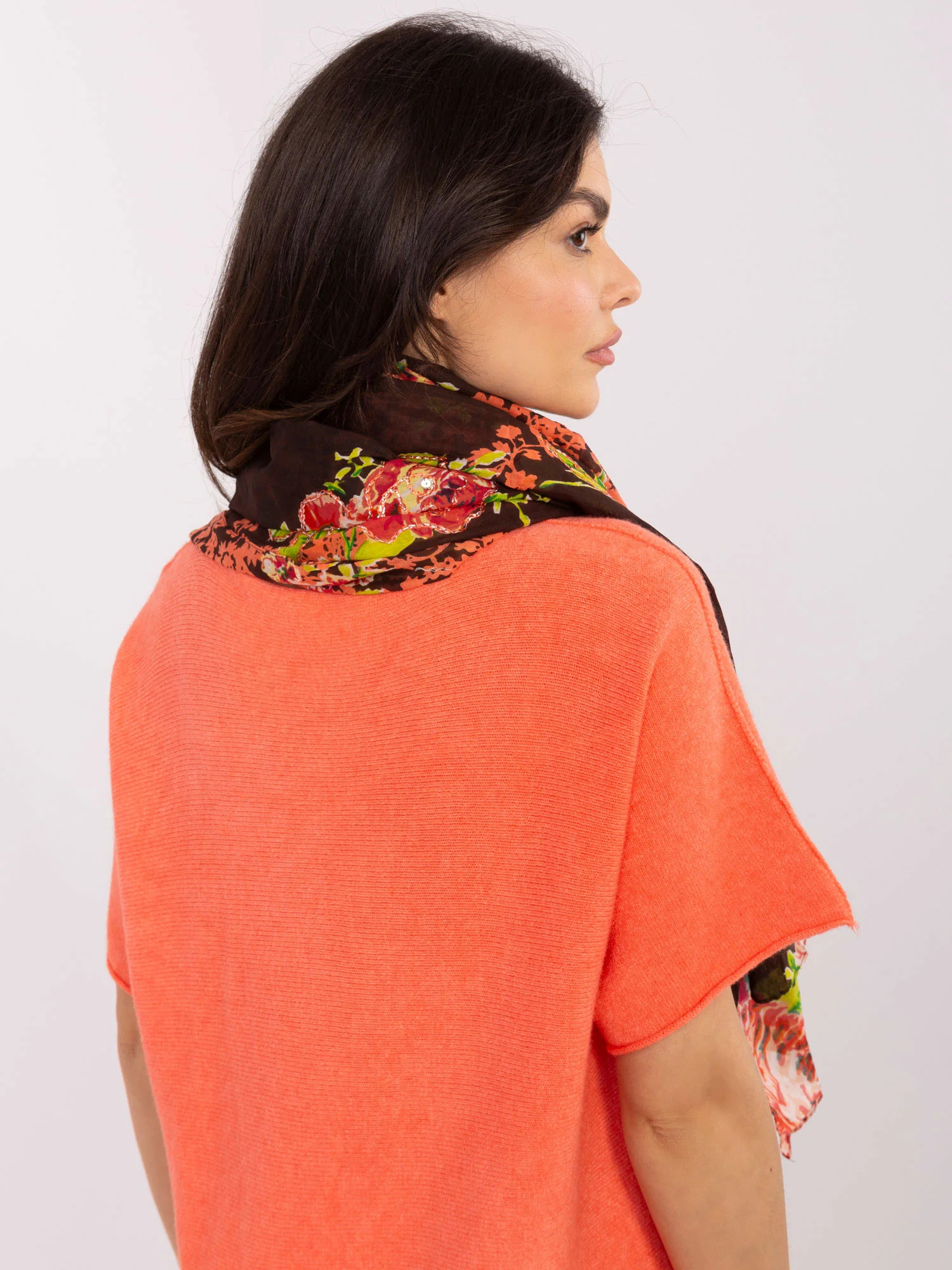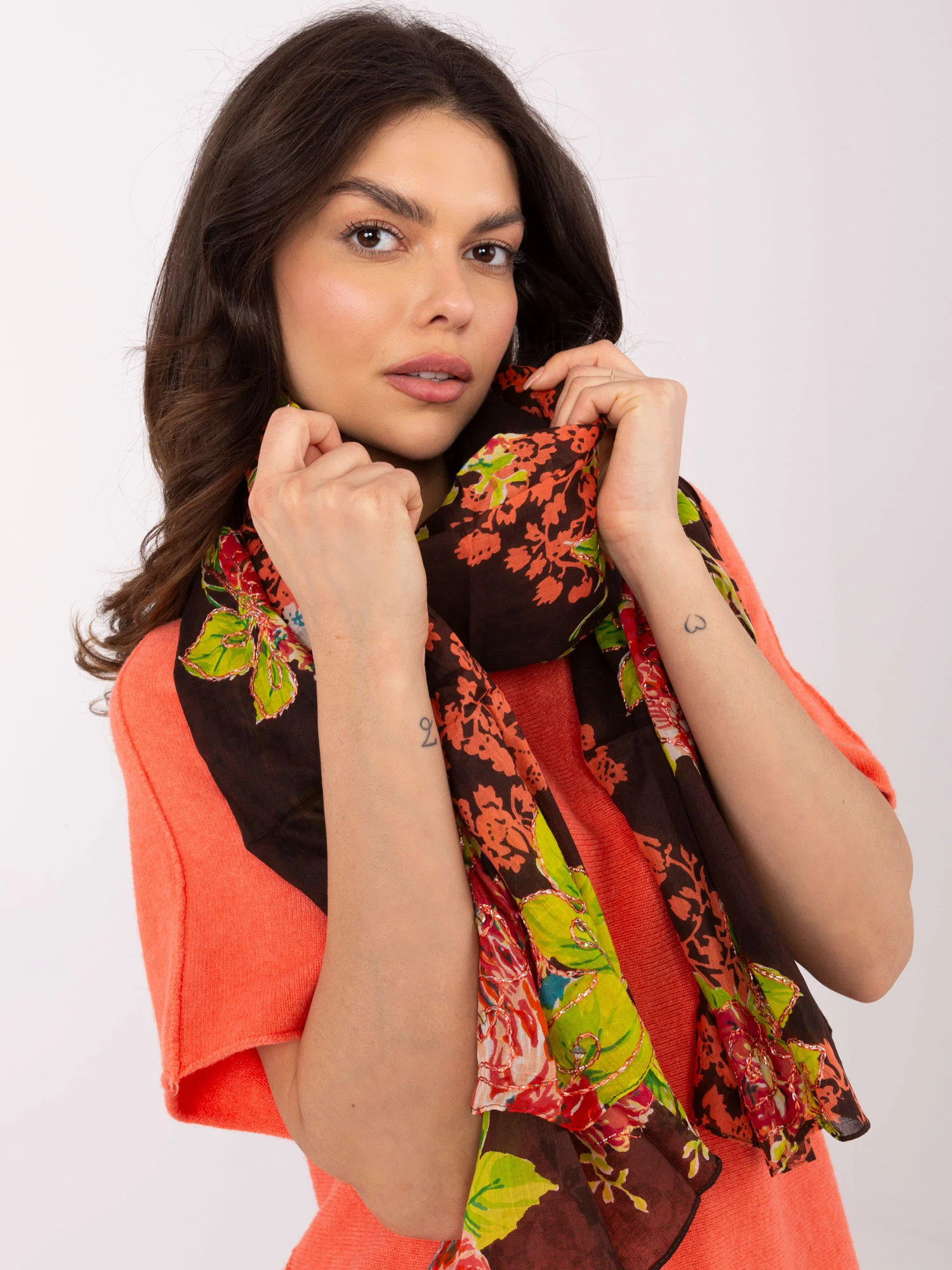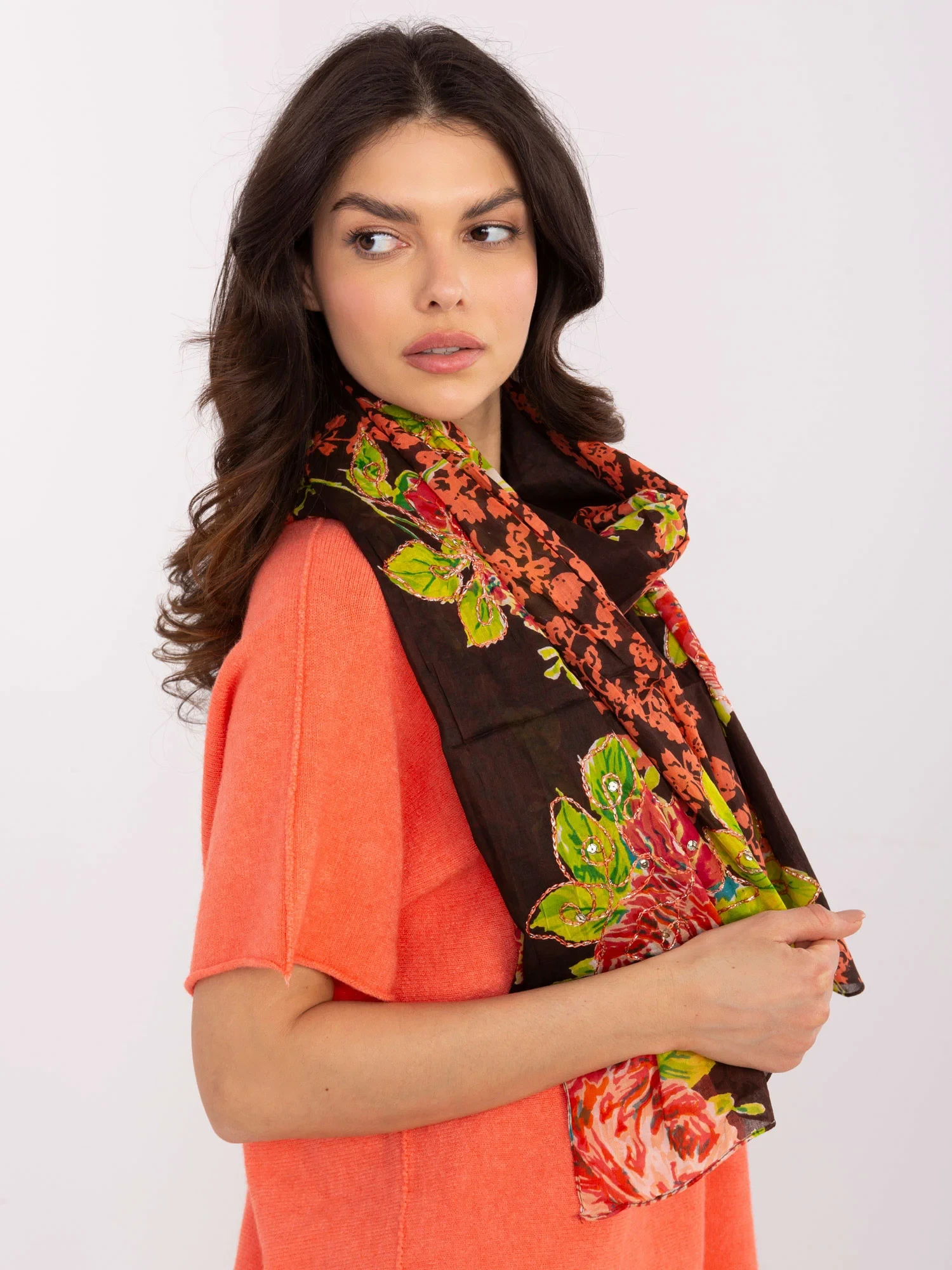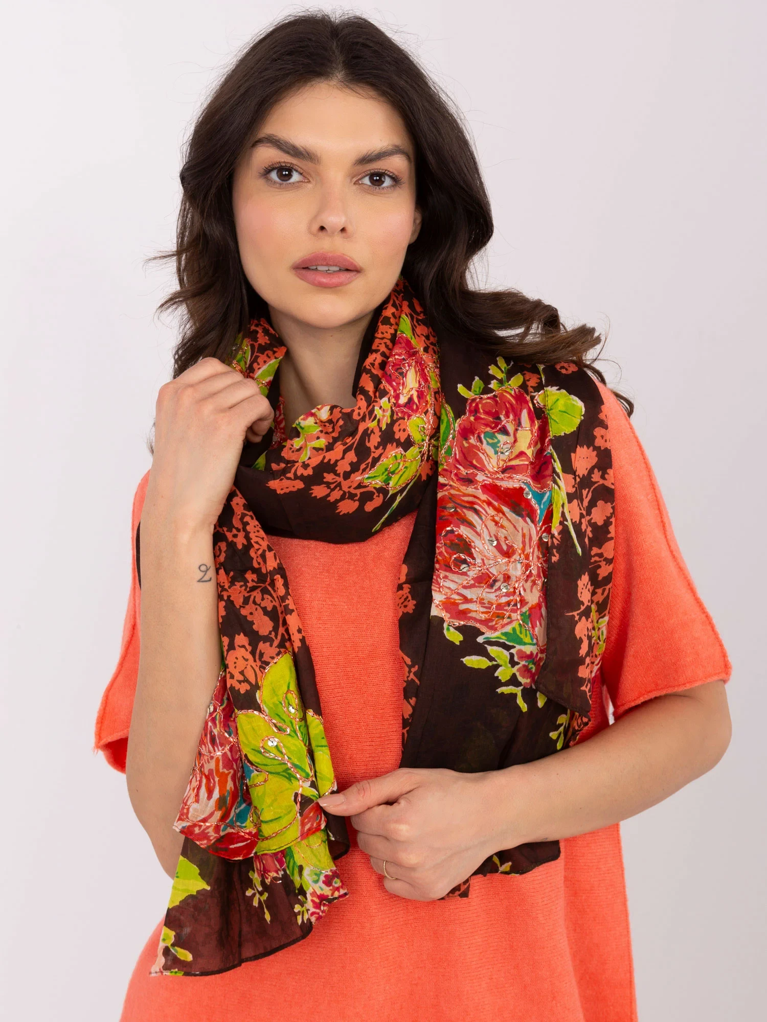 Tmavě hnědá šála s květinovými vzory .