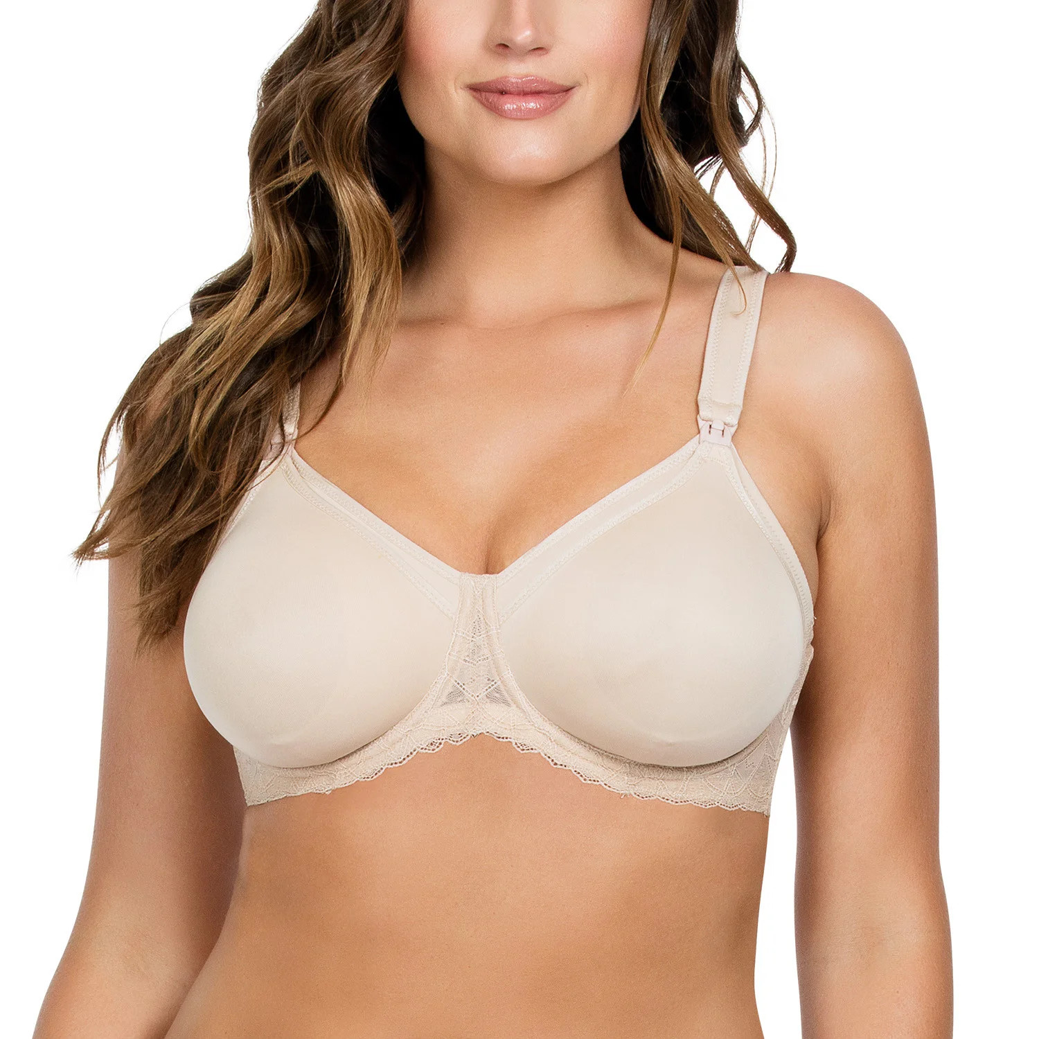 Podprsenka značky Parfait, model NB502, má drátky, které podpírají a tvarují prsa, svislé kostice na bocích, nastavitelná ramínka, která nelze odepnout, plastové háčky na ramínkách, zapínání na háčky na zádech, vyrobena z 80 % polyamidu, 20 % elastanu, odnímatelné košíčky, těhotenská, dámská.