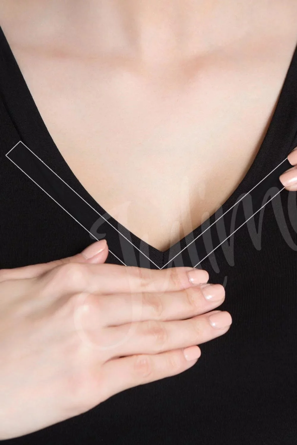 Oboustranná lepící páska na komfortní košilky a šaty s hlubokým výstřihem. Jednou částí se lepí na tělo,druhou stranou na vnitřní stranu oděvu. Slouží k tomu, aby výstřih držel tvar a nebylo vidět to, co dáma nechce, aby vidět bylo. Páska je neviditelná pro oko a bezpečná pro pokožku, protože je vyrobená ze 100% hypoalergenního materiálu. Balení obsahuje 25 ks 10 cm pásků šíře 10 mm nebo 20 mm. Před praním je třeba pásku ze šatů odstranit.