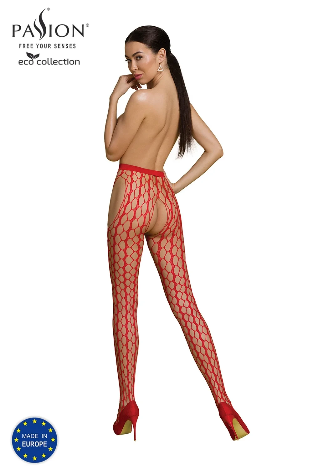 Punčochové zboží značky Passion. ECO model S007. Výrobek je vyroben z 83 % z regenerovaného nylonu a 17 % z rozložitelného elastanu. Výrobek pro ženy. Spodní prádlo se vyznačuje rozparkem v rozkroku.