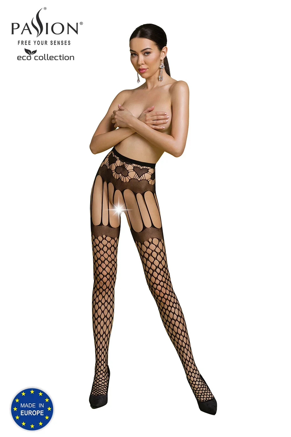 Punčochové zboží značky Passion, model ECO S009. Výrobek je vyroben z 83 % z regenerovaného nylonu, 17 % z rozložitelného elastanu. Dámský výrobek. Spodní prádlo se vyznačuje rozparkem v rozkroku.