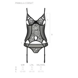 Korzet značky Passion. Model korzetu Primula. Výrobek je vyroben ze 47 % z polyamidu, 43 % z regenerovaného polyamidu, 7 % z regenerovaného elastanu a 3 % z lycry. Upevňovací bod: vzadu. Typ výstřihu: špičatý. Výrobek pro ženy. Dva stupně vodorovných háčků. Dvanáct řad svislých háčků. Výrobek má nastavitelné ramenní popruhy. Popruhy jsou nastavitelné. Má dráty, které prsa vhodně tvarují. Korzet se zapínáním na háčky a oka. Klasické kalhotky.
