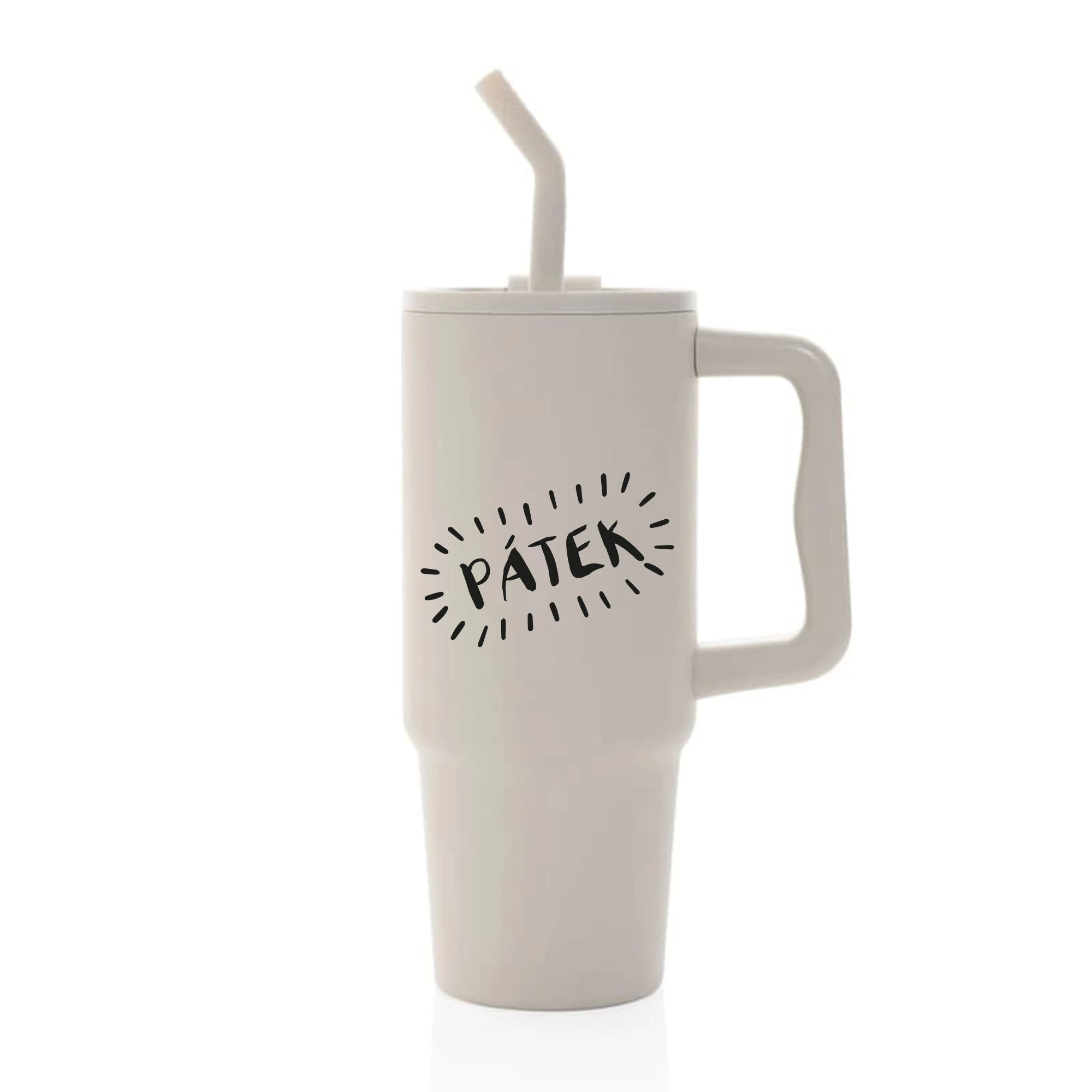 A ten potisk? „PÁTEK“ – protože pátek je prostě stav mysli 😎🎉. Hodí se do práce, na cestu i na lenošení doma. Díky dvojité stěně udrží tvůj nápoj dlouho horký nebo naopak krásně ledově studený.