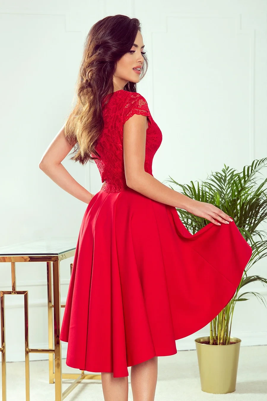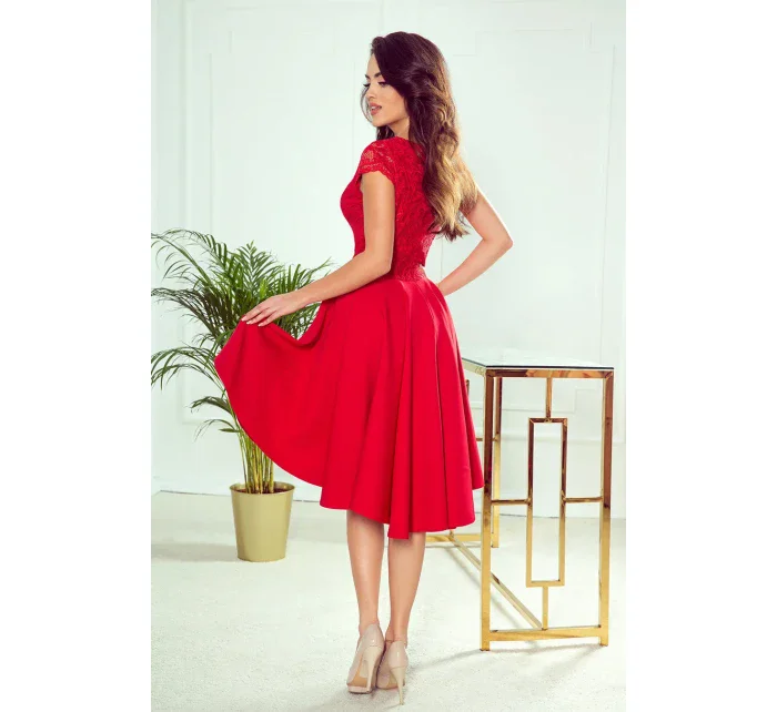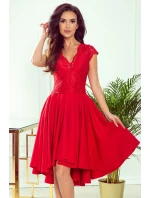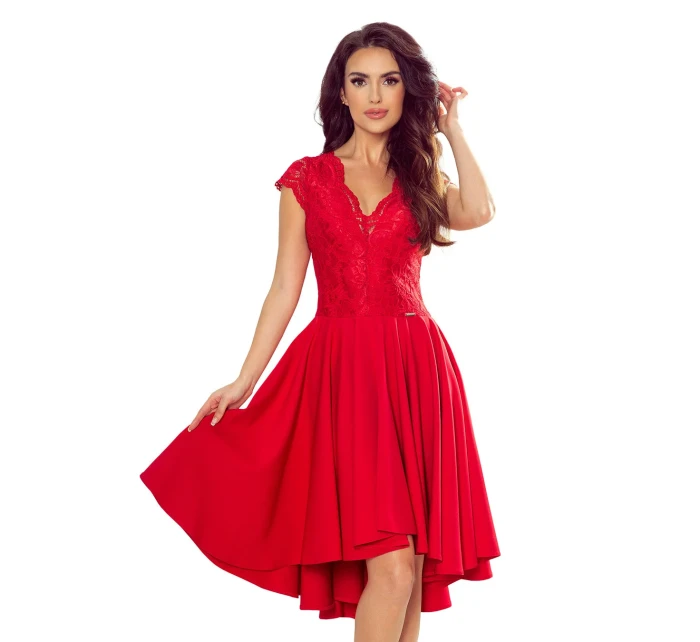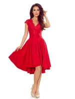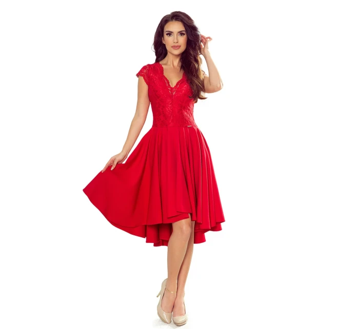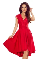 Patricia - exkluzivní asymetrické dámské šaty s delším zadním dílem, krátkými rukávy, výstřihem a krajkou.