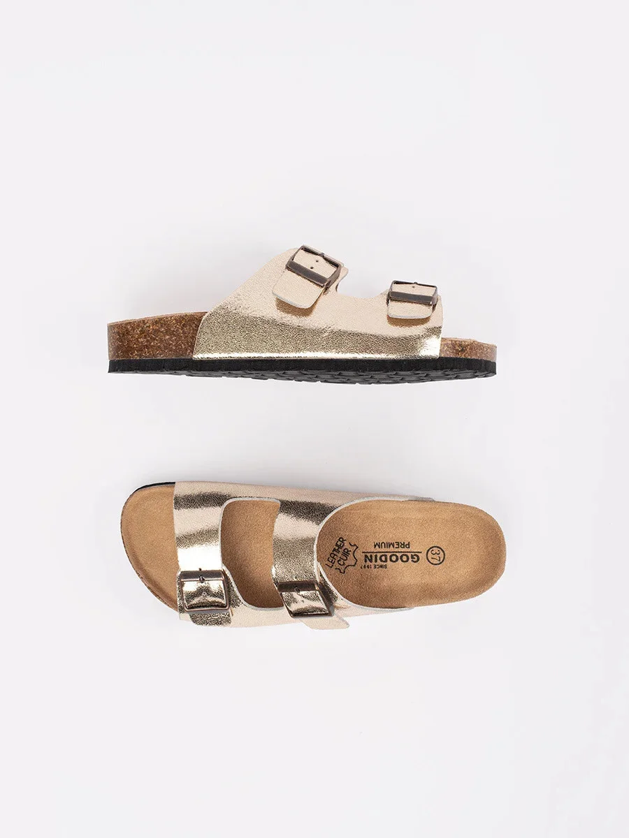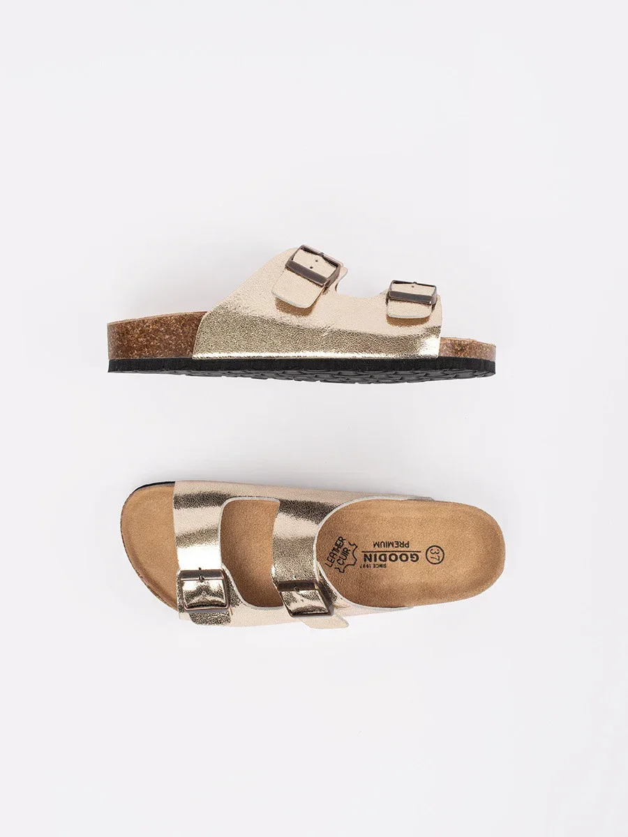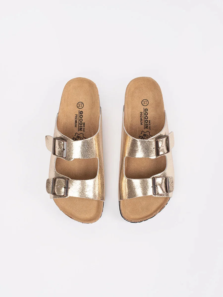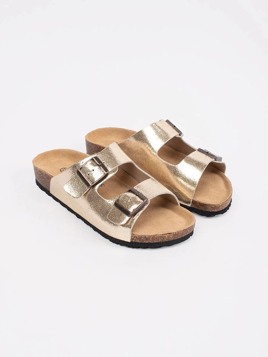 Pěkné zlaté dámské nazouváky na plochém podpatku