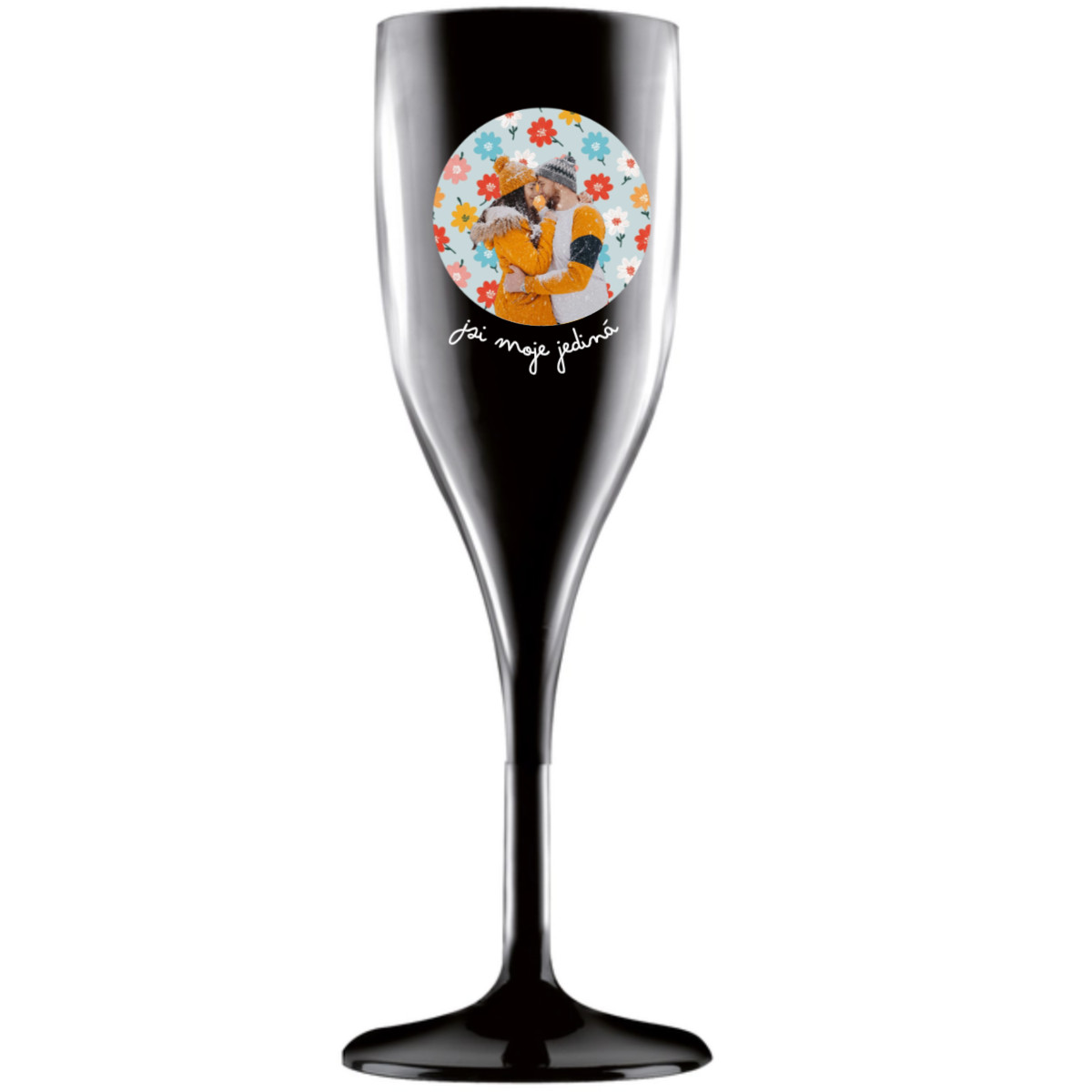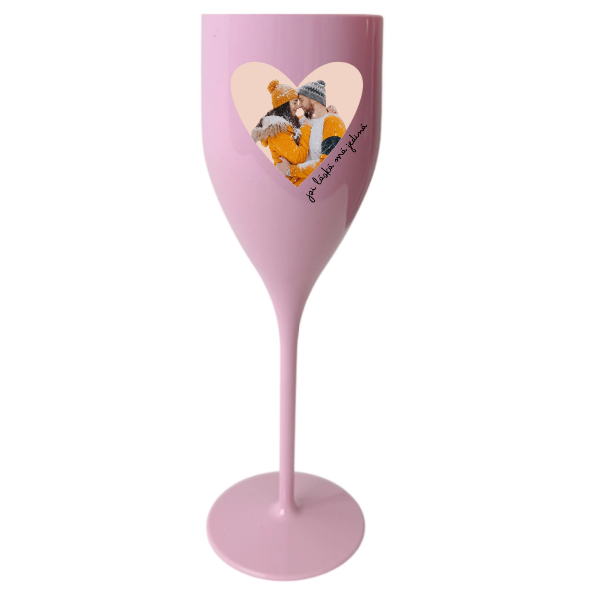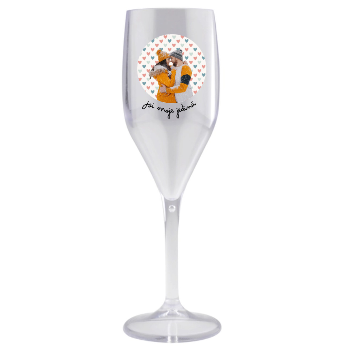 Personalizovaná nerozbitná prosecco sklenice s výřezem fotky na podkladu