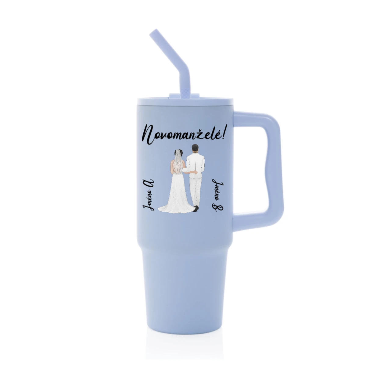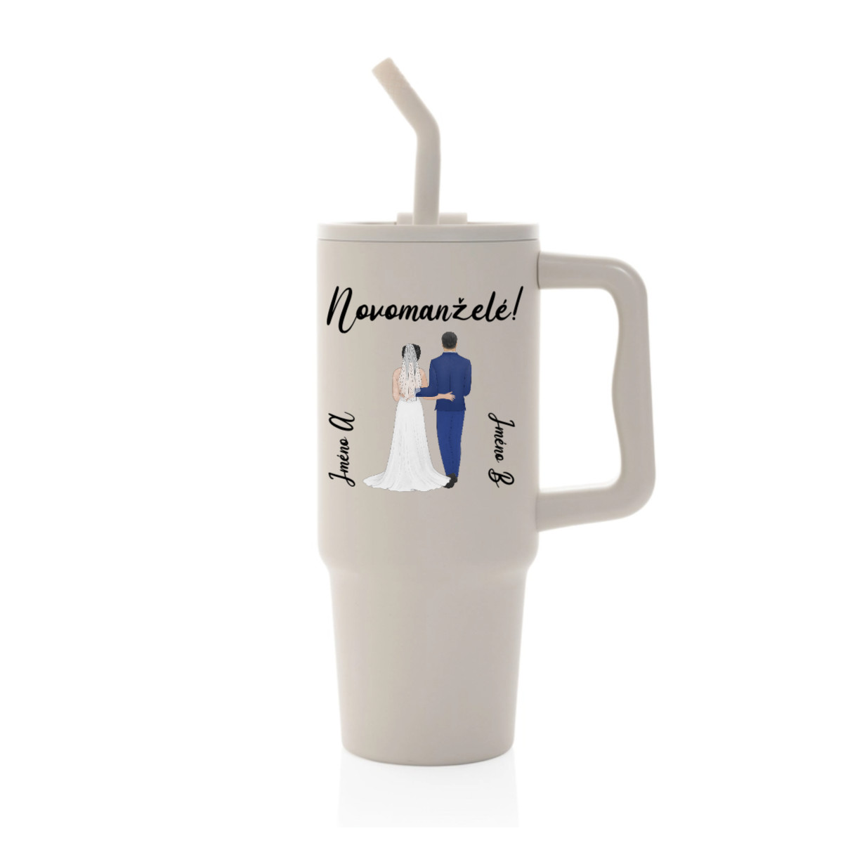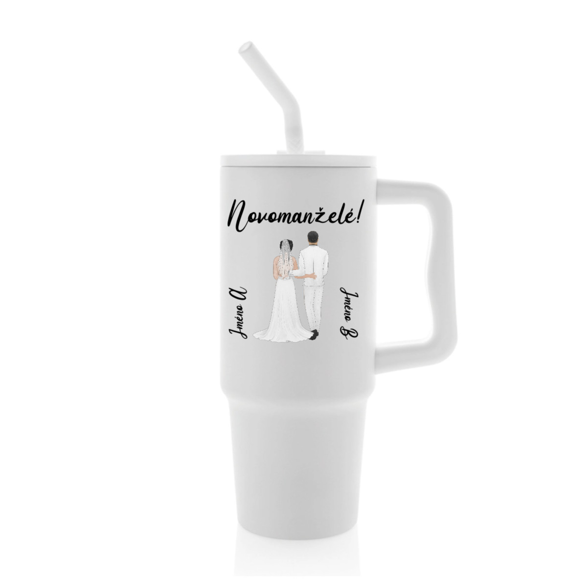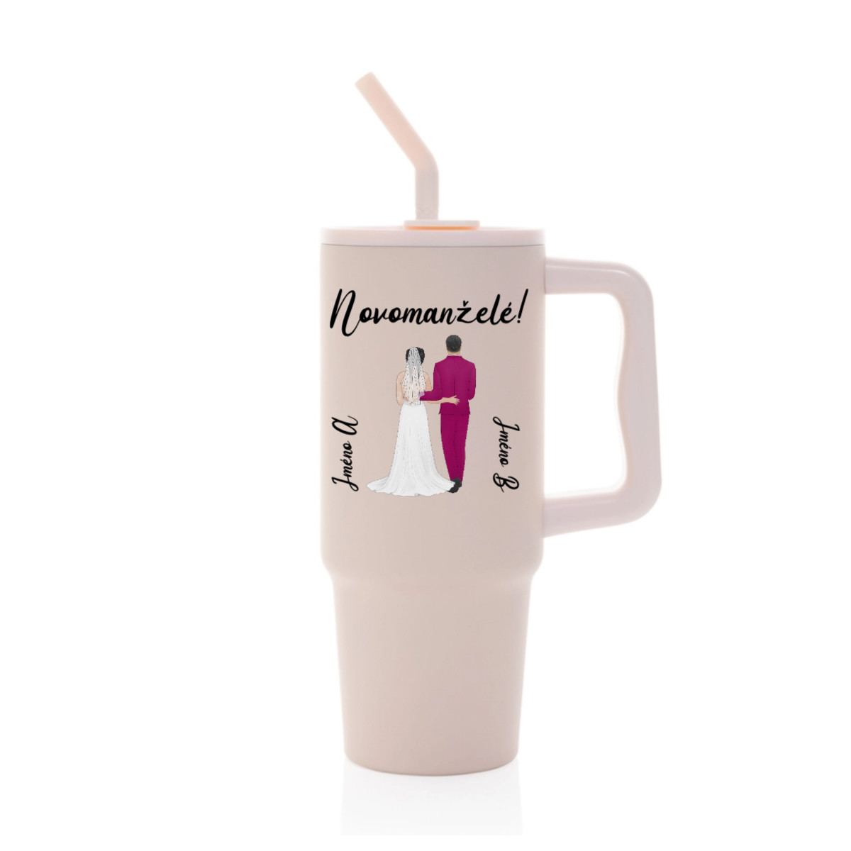 Personalizovaná termoska s barevným víčkem s novomanželským párem