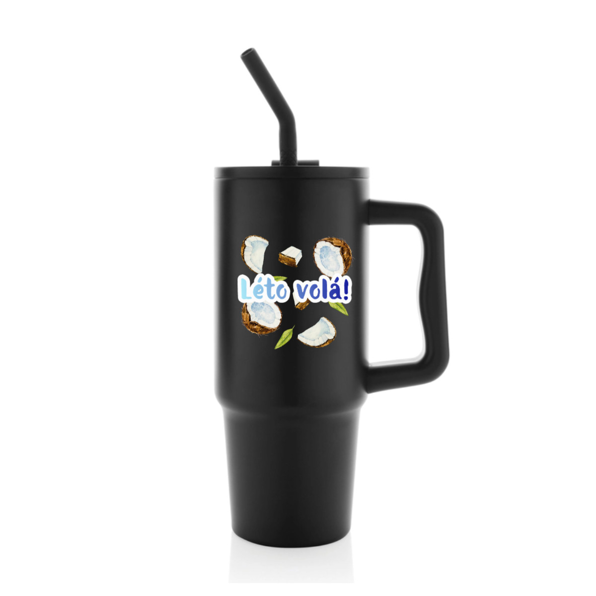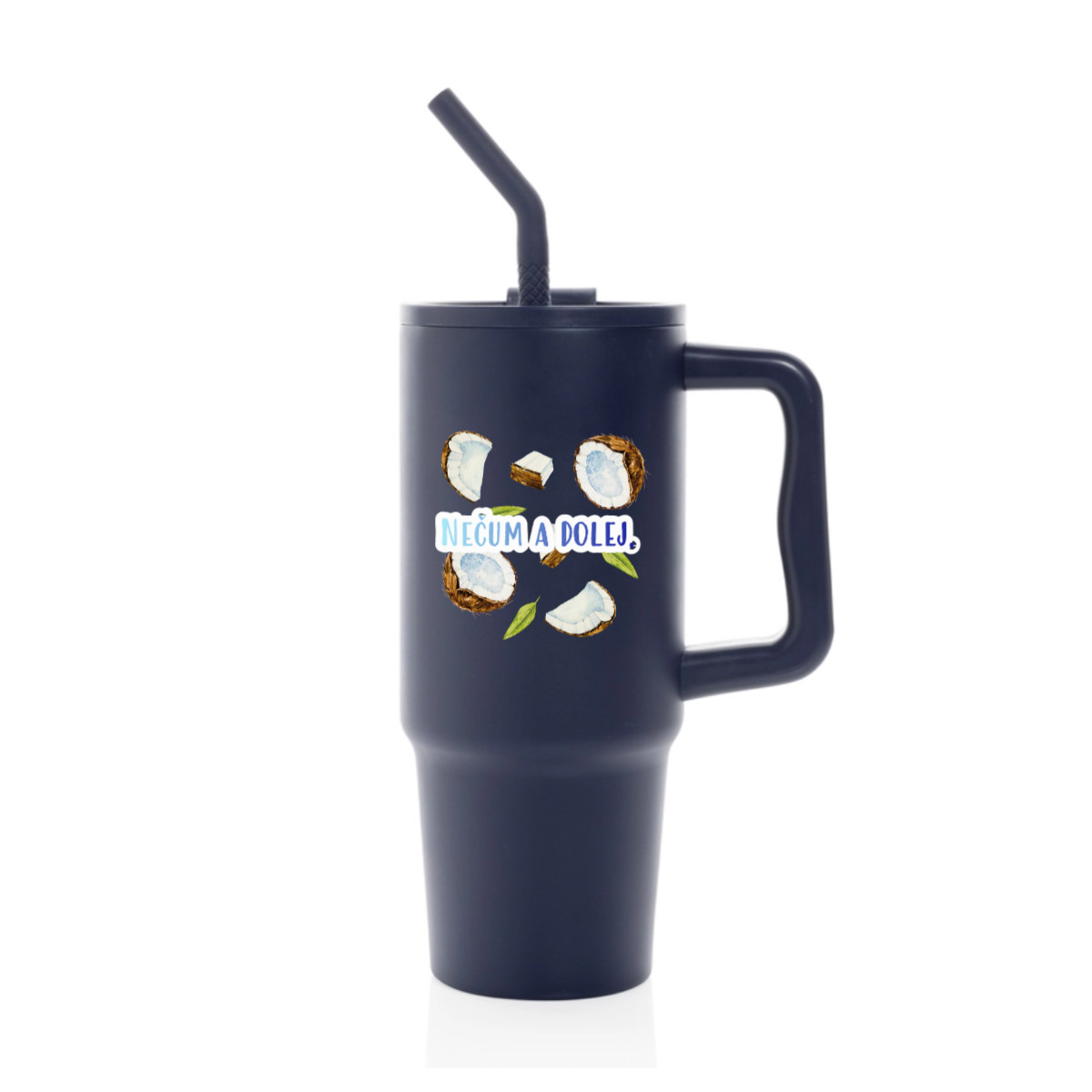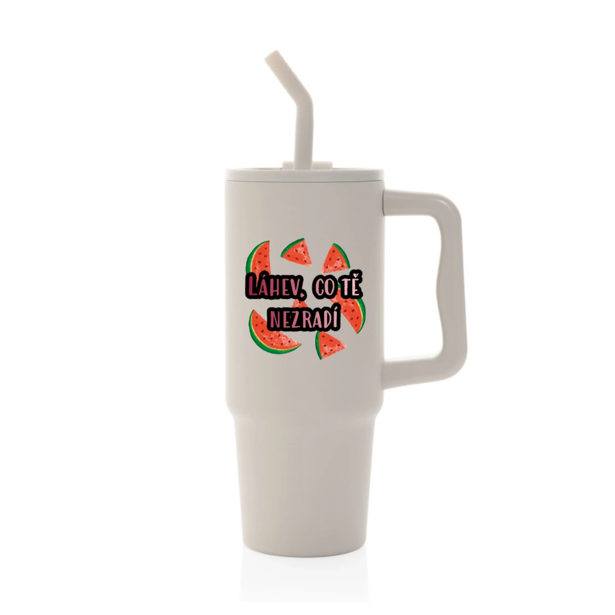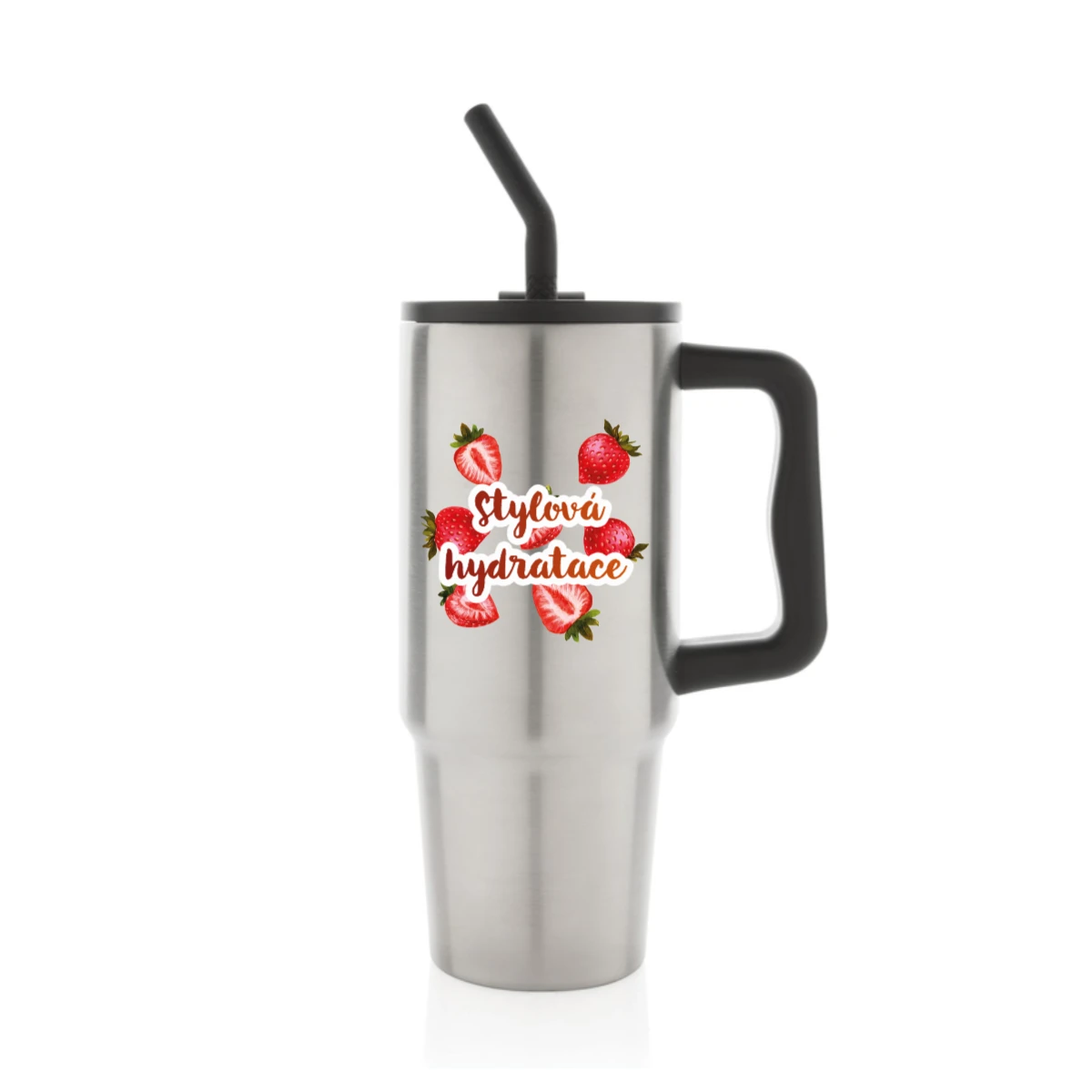 Velký cestovní termohrnek s brčkem a uchem – s vlastním motivem a textem