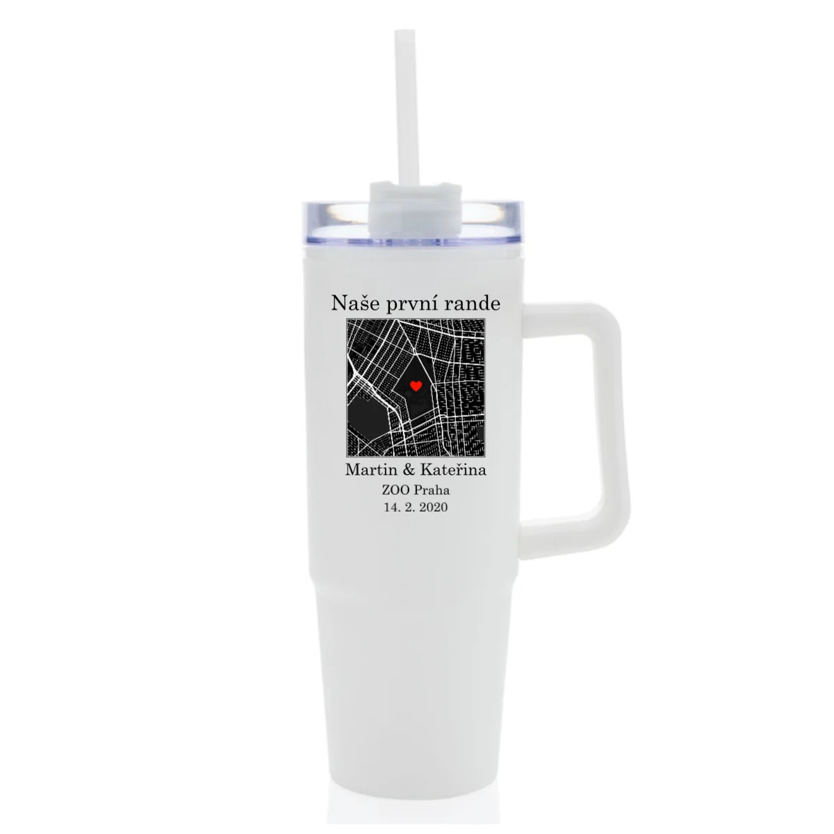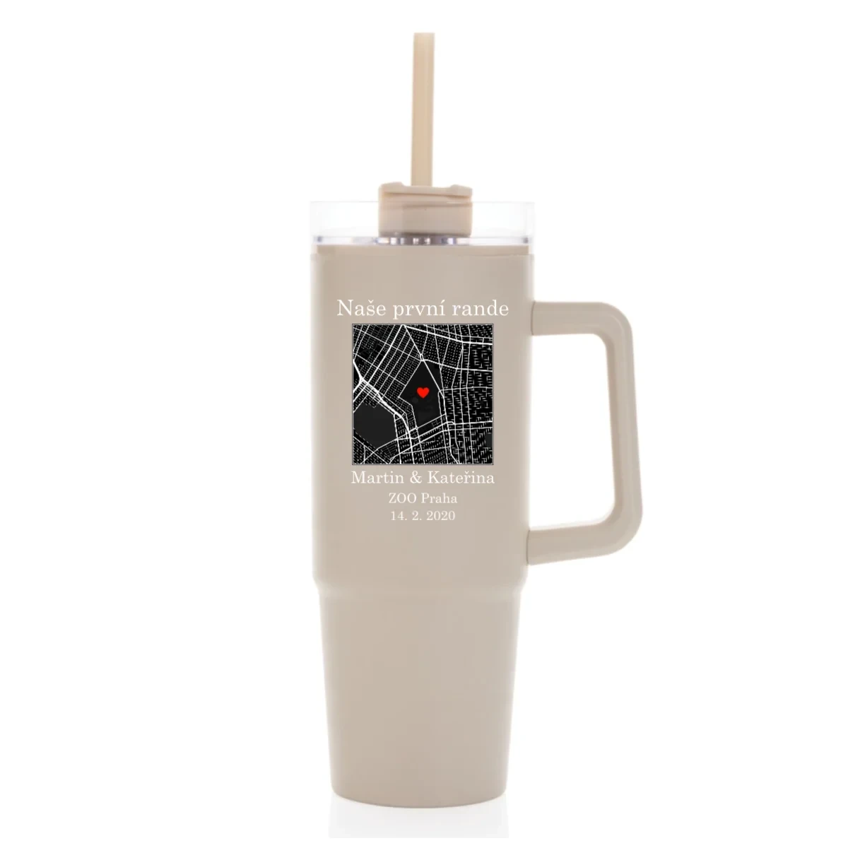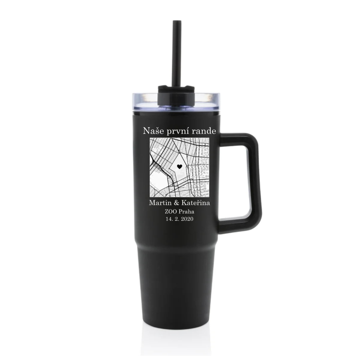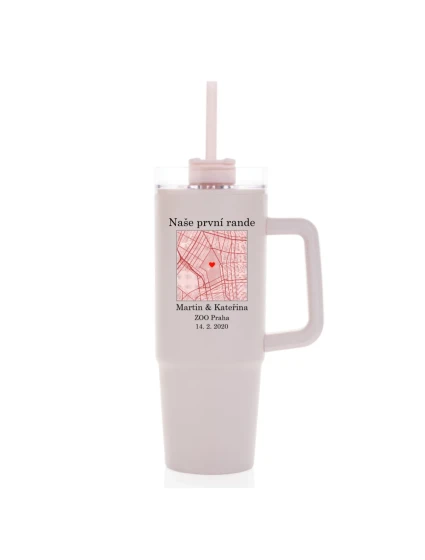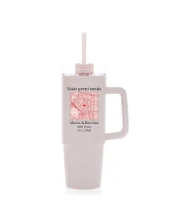 Hledáte originální dárek nebo něco, co bude opravdu Vaše? Tento velký cestovní hrnek (900 ml) spojuje praktičnost s emocemi. Vyberte si mapu místa, které má pro Vás zvláštní význam – třeba místo prvního rande, výletu snů nebo jiné vzpomínky. Na mapě označíte přesnou adresu, přidáte dvě jména a vlastní popisek – a vznikne jedinečný hrnek, který bude mluvit za Vás.