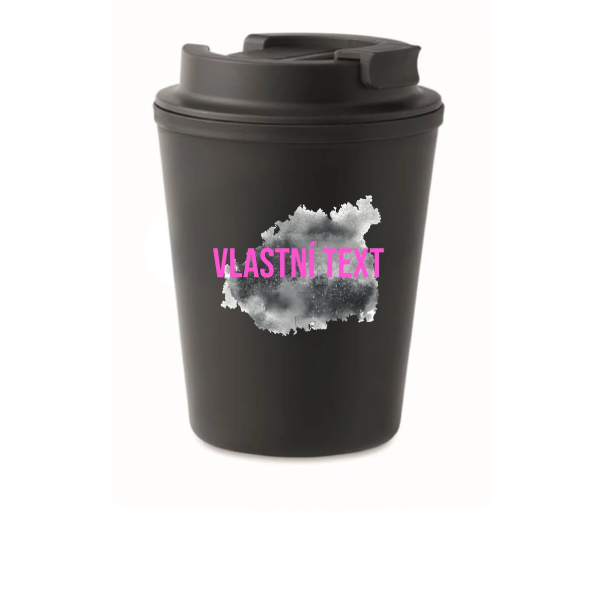☕ Vyber si černý nebo bílý cestovní hrneček ve velikosti 300 ml nebo 475 ml, přidej vlastní text, zvol si typ a barvu písma i barvu stylového „fleku“.