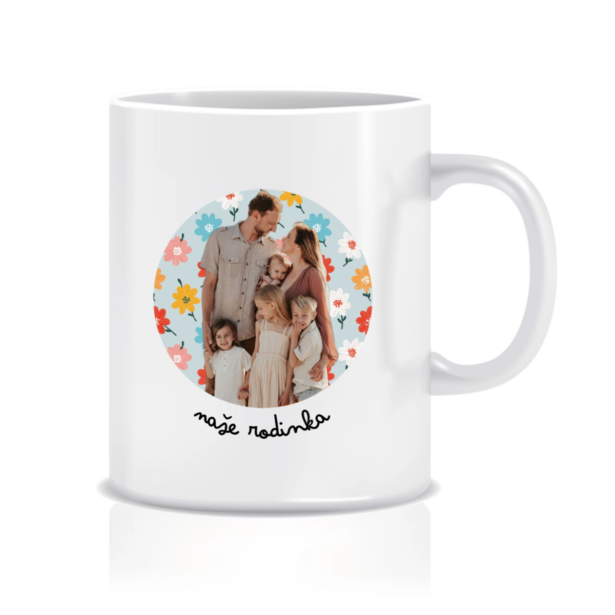 Personalizovaný klasický bílý hrníček s výřezem fotky na podkladu