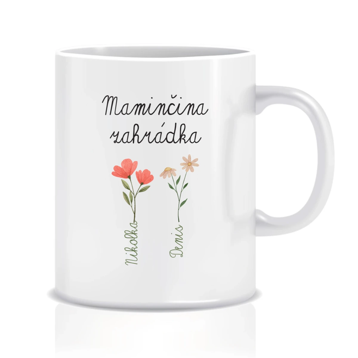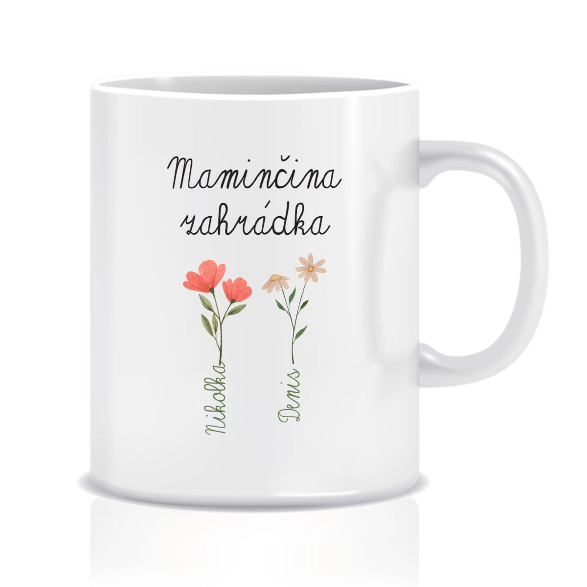 Na hrnku si můžete zvolit 1 až 6 květinek, přičemž každá květinka představuje jedno maminčino dítě. Ke každé květince doplníte jméno, a vznikne tak jedinečný, osobní kousek, který zahřeje u srdce při každém doušku.