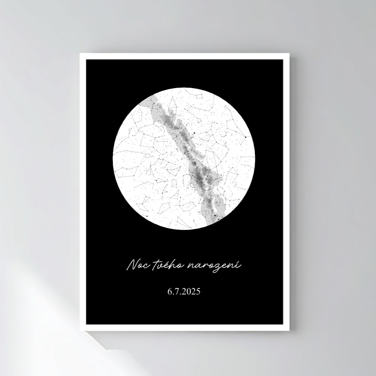 Vytvořte jedinečný obraz hvězdné oblohy přesně tak, jak vypadala v konkrétní chvíli a na konkrétním místě. Stačí zadat adresu a datum – my podle nich vygenerujeme autentickou hvězdnou mapu, která zachytí výjimečný okamžik Vašeho života. Výsledkem je osobní a nadčasový doplněk interiéru nebo krásný dárek k narozeninám, výročí, svatbě či narození dítěte.