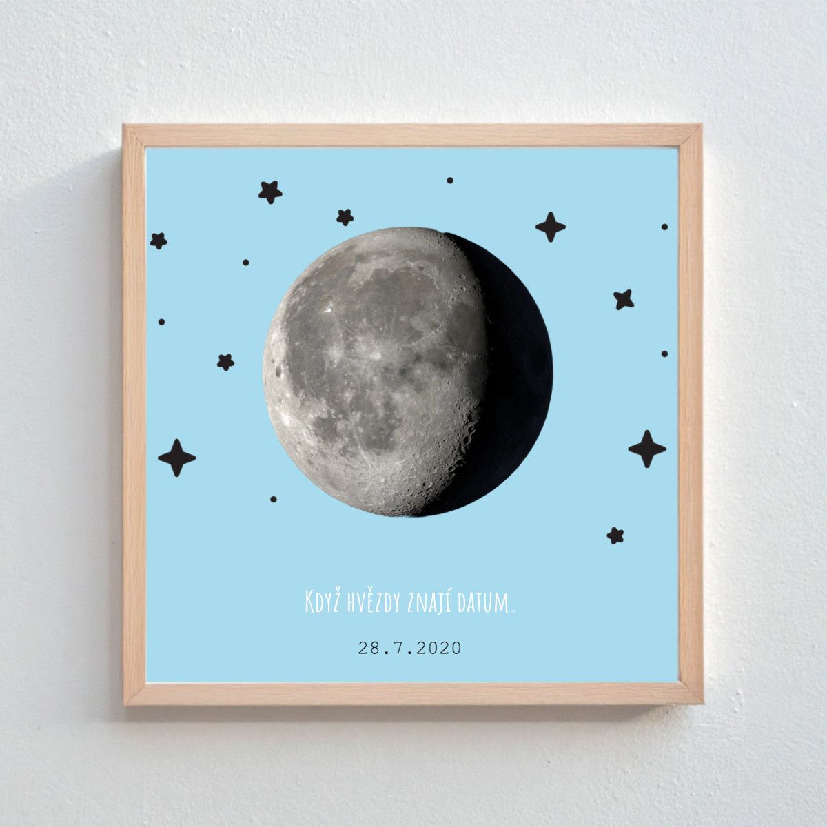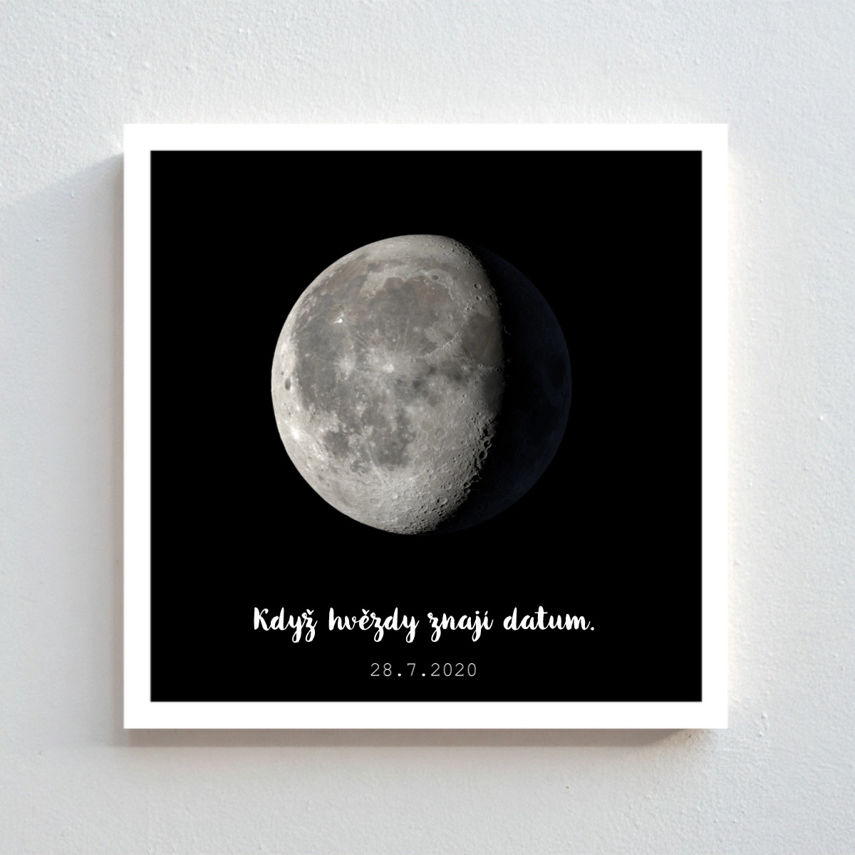 Datum, které změnilo všechno. Obloha, která ho nese. Na základě zvoleného data se na plakátu zobrazí skutečná měsíční fáze, přesně tak, jak byla vidět v ten den – ať už šlo o narození, svatbu, seznámení nebo jiný důležitý okamžik.