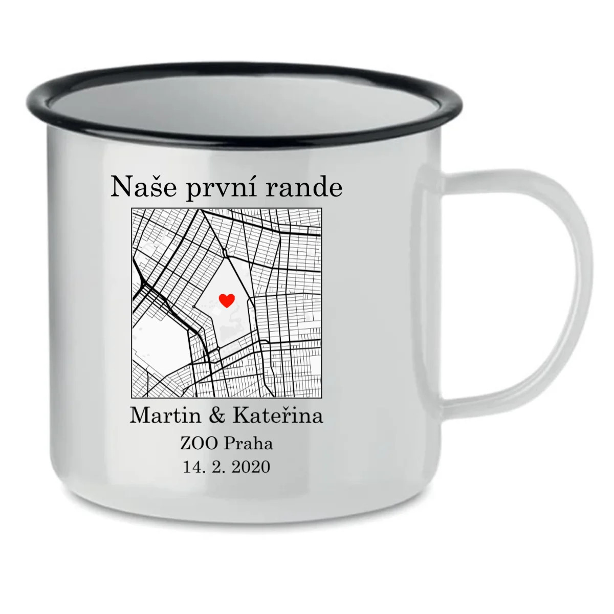 Někdy jedno místo řekne více než tisíc slov. Tento stylový retro plecháček v černém nebo bílém provedení uchová vzpomínku na výjimečný okamžik – ať už šlo o první rande, nezapomenutelný výlet nebo jinou životní událost. Na hrnek umístíme mapu dle Vašeho výběru, zaznačíme konkrétní adresu, přidáme dvě jména a osobní popisek. Výsledkem je jedinečný plecháček s příběhem, který zahřeje dvakrát – nápojem i vzpomínkou.