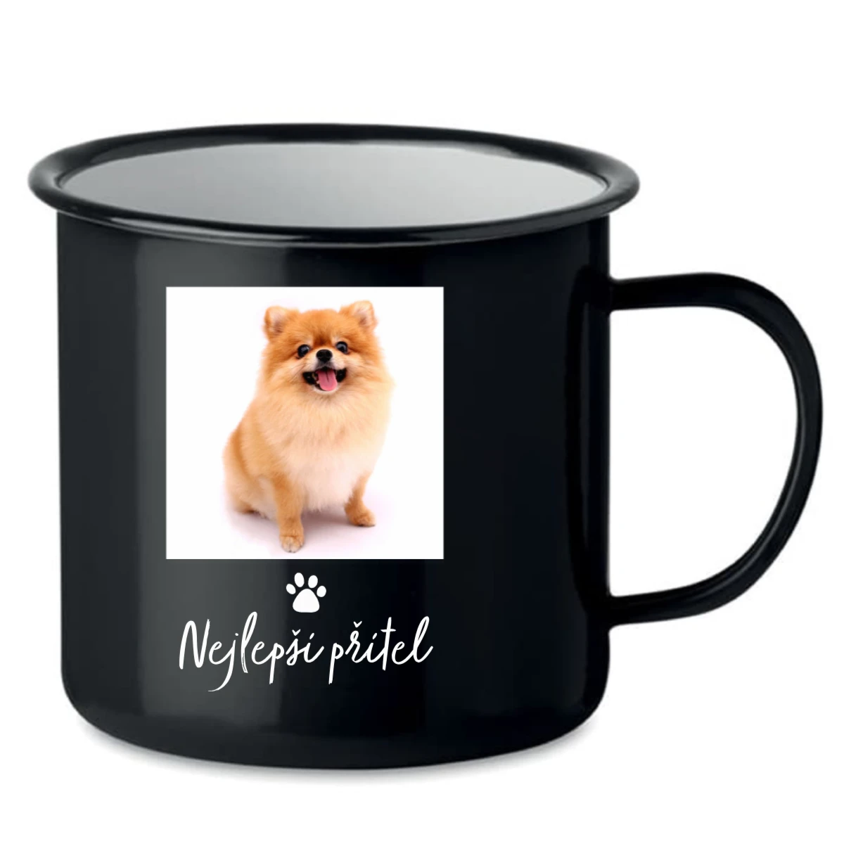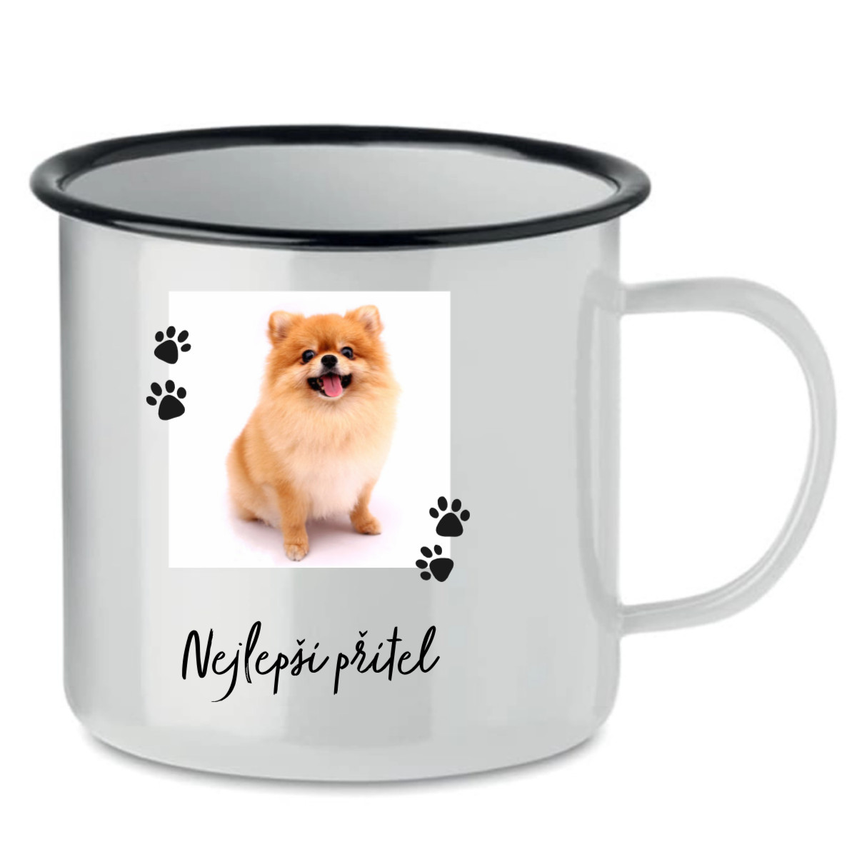 Stylový retro plecháček o objemu 300 ml z edice Domácí mazlíček, který si můžeš vytvořit přesně podle sebe. Nahraj fotografii svého mazlíčka, vyber si druh tlapiček a doplň vlastní popisek – jméno, vzkaz nebo oblíbenou hlášku.