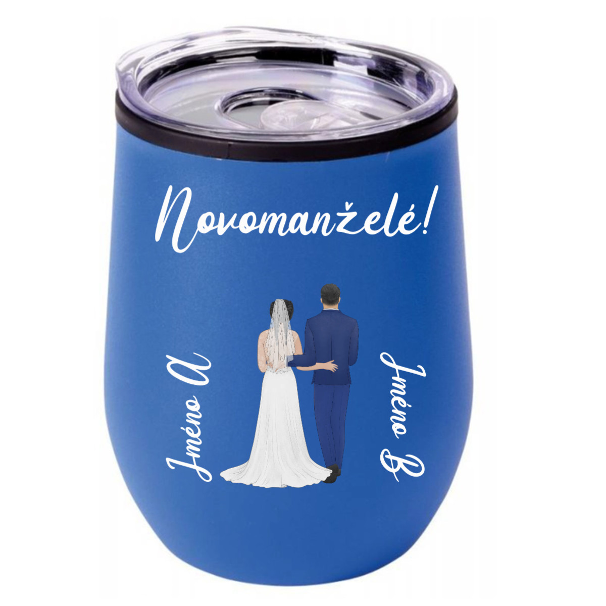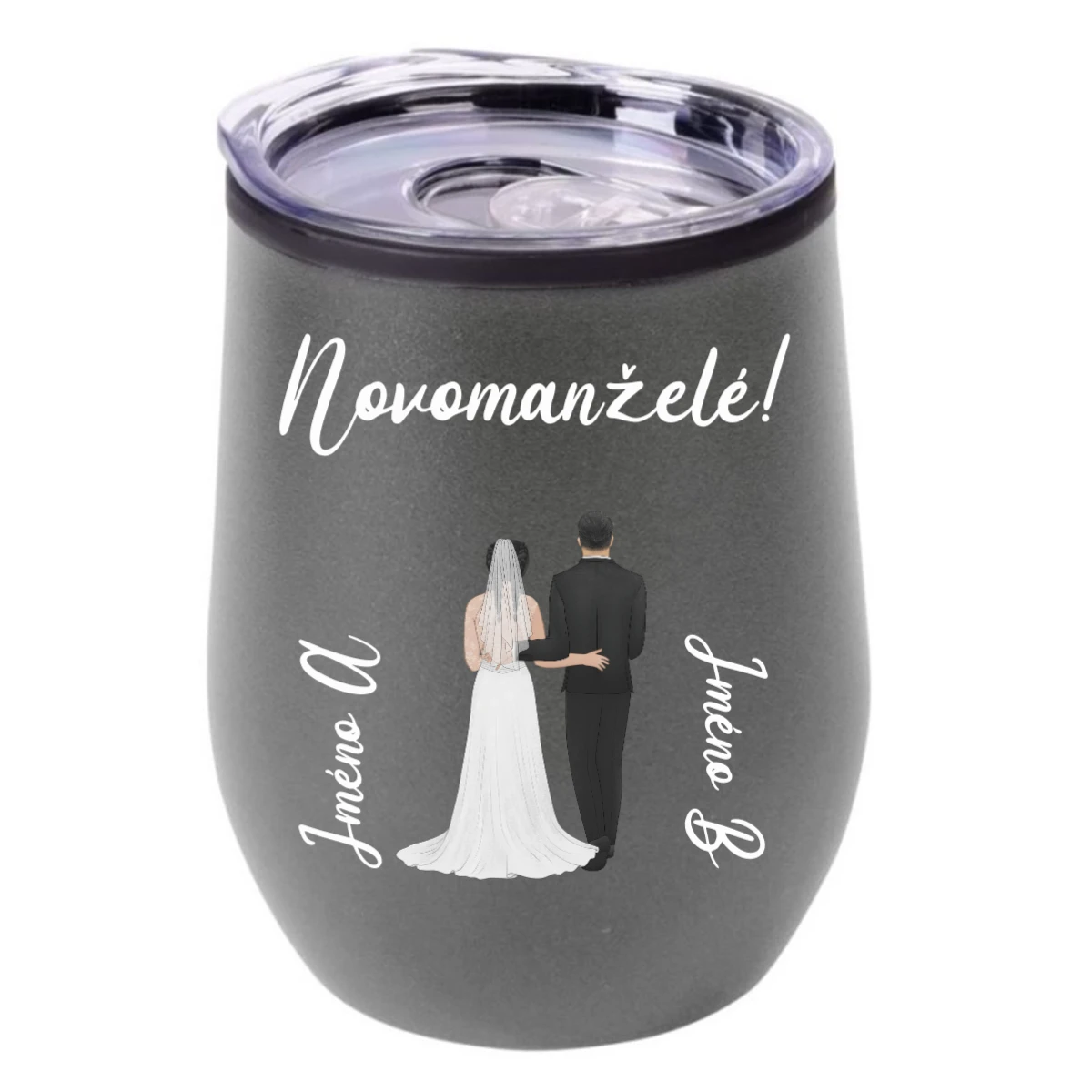 Na hrnku je Váš vlastní text – třeba „Novomanželé“, „Náš příběh“ nebo cokoliv, co vystihuje právě Vás. A aby byl opravdu jedinečný, můžete si na něj přidat i personalizovaný pár podle sebe: