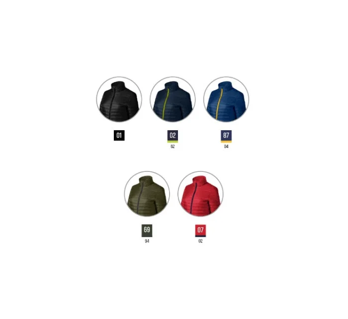 sbalitelná do vnitřní kapsy lehký hřejivý materiál členěný prošíváním střih tvarovaný bočními díly celopropínací kostěný zip s krytkou brady kapsy s kostěným zipem vnitřní kapsa na suchý zip vstup pro branding v bočním švu podšívky lemování elastickým proužkem
