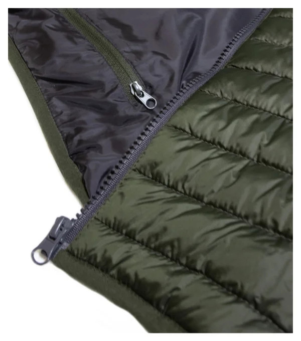 sbalitelná do vnitřní kapsy lehký hřejivý materiál členěný prošíváním rovný střih s bočními díly celopropínací kostěný zip s krytkou brady kapsy s kostěným zipem vnitřní kapsa na suchý zip vstup pro branding v bočním švu podšívky lemování elastickým proužkem