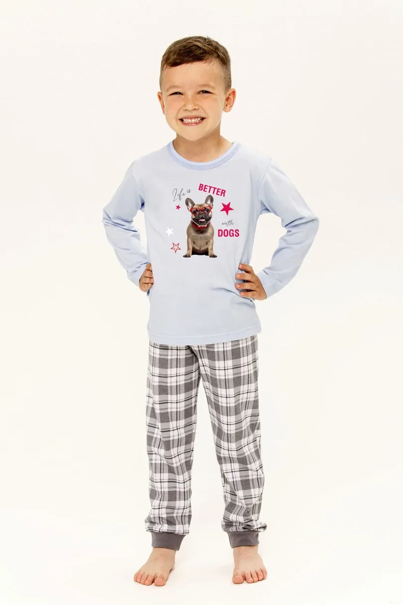 Chlapecké pyžamo z kvalitní bavlny. Tričko s dlouhými rukávy zdobené potiskem. Dlouhé kostkované kalhoty se stahovací šňůrkou v pase a pohodlnou gumou