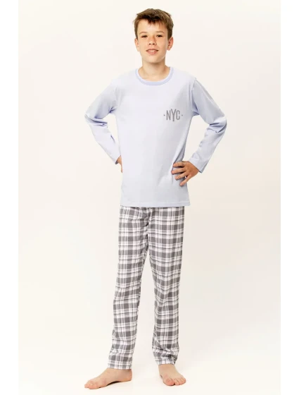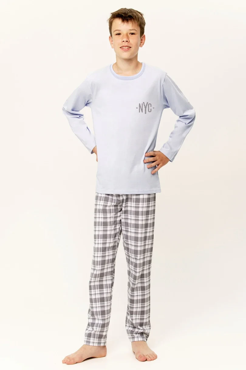 Chlapecké pyžamo z kvalitní bavlny. Tričko s dlouhými rukávy zdobené jemným potiskem. Dlouhé kostkované kalhoty s pohodlnou gumou v pase