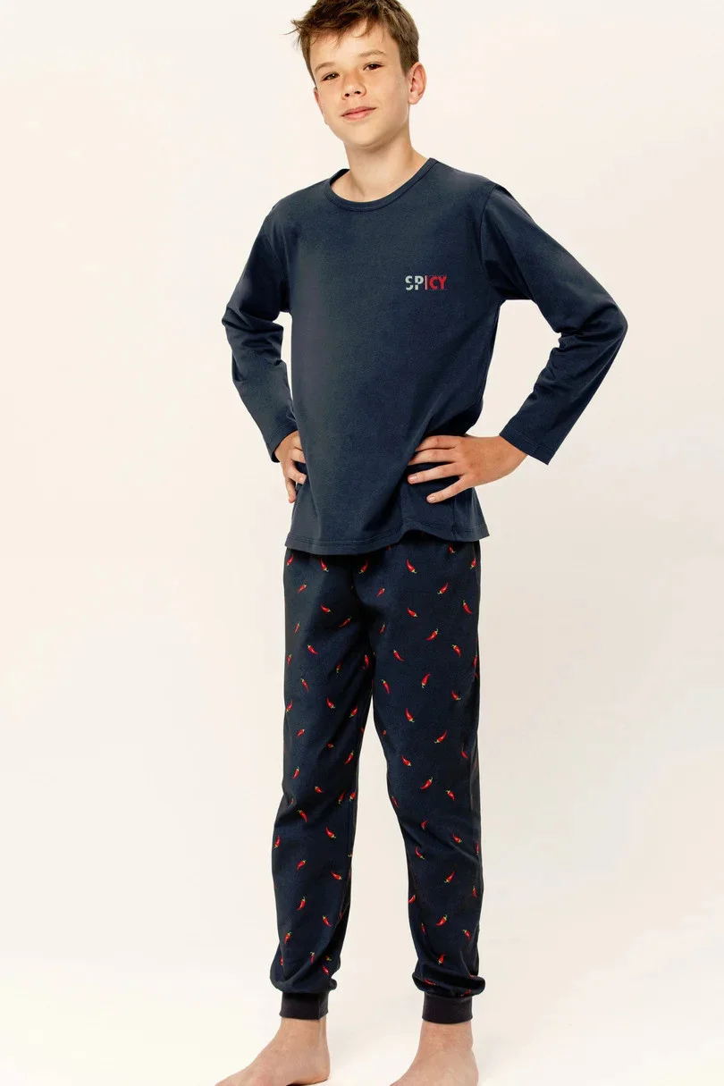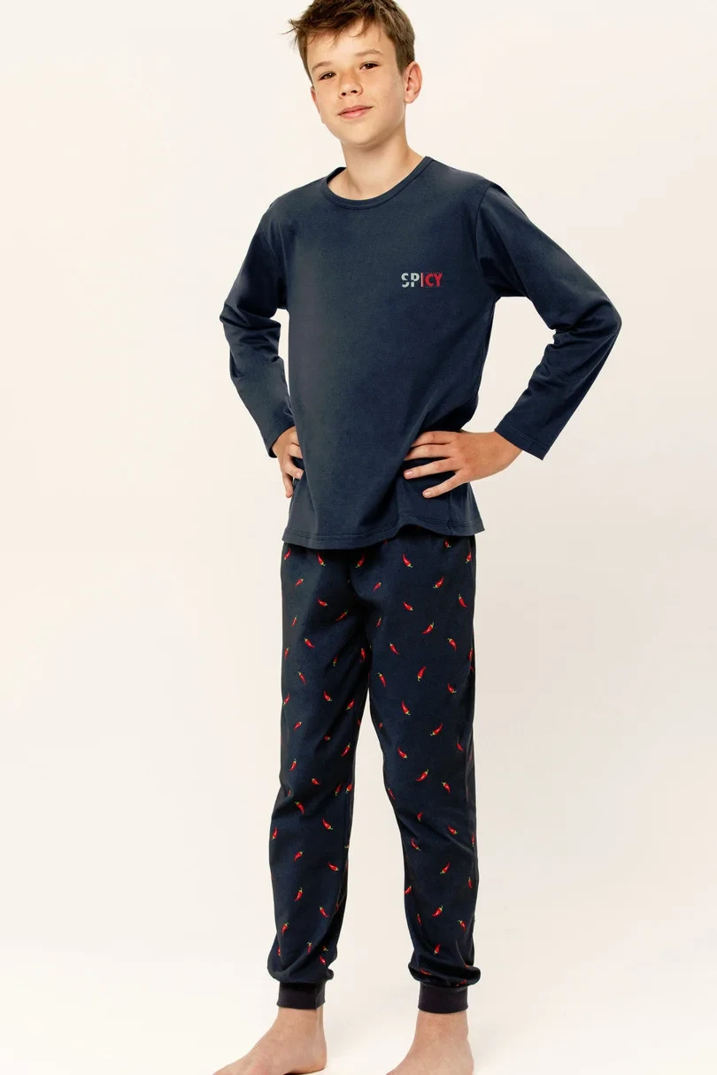 Přítelovo pyžamo s dlouhými rukávy, jednobarevné, jemný potisk na hrudi. Dlouhé vzorované kalhoty s manžetami.