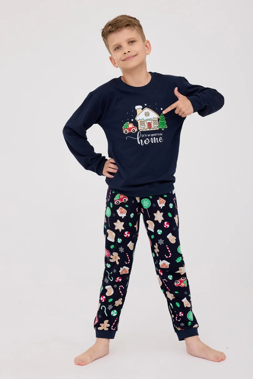 Chlapecké pyžamo z měkké bavlny, tričko s dlouhým rukávem a barevným potiskem na přední straně, dlouhé vzorované kalhoty s výstřihem, manžetami a spodním lemem s pohodlnou šňůrkou v pase, pyžamo balené v krabici.