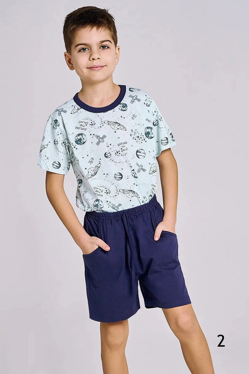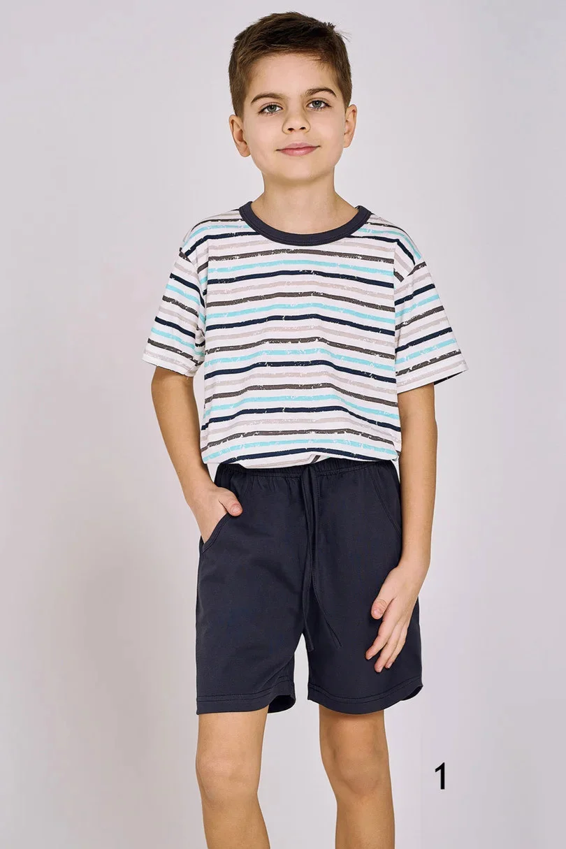 Klasické chlapecké pyžamo s krátkým rukávem, vyrobené z bavlny, pruhované tričko, kulatý výstřih. Doplněné pevnými krátkými šortkami s kapsami a nastavitelnou šňůrkou.