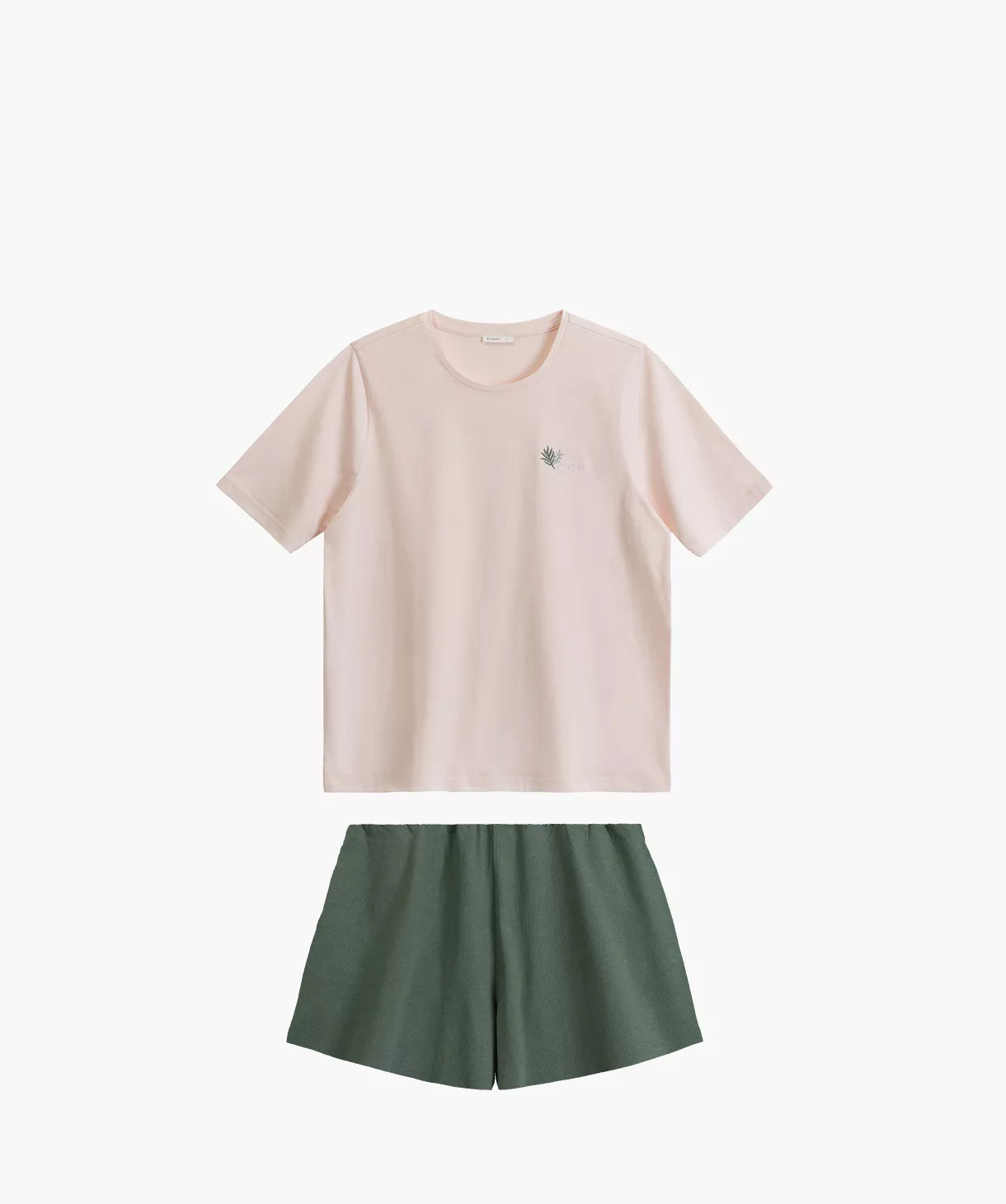 Ta piżama damska, składająca się z luźnej koszulki z krótkimi rękawkami i krótkich spodenek, to doskonały wybór na każdą porę roku. Koszulka w kolorze jasno różowym, z okrągłym wycięciem przy szyi, ozdobiona jest po lewej stronie niewielkim logo ATLANTIC, obok którego znajduje się wyhaftowana gałązka. Zielone spodenki mają nieuciskający ciała ściągacz w talii oraz praktyczne kieszenie po bokach.