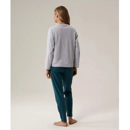 Ta piżama damska to idealna propozycja na chłodne, jesienno-zimowe noce. Luźna bluza typu longsleeve ma okrągłe wycięcie przy szyi, długie rękawy bez ściągaczy oraz niewielkie logo ATLANTIC, obok którego znajduje się wyhaftowana gałązka. Spodnie mają delikatnie zwężające się ku dołowi nogawki i praktyczne kieszenie po bokach.