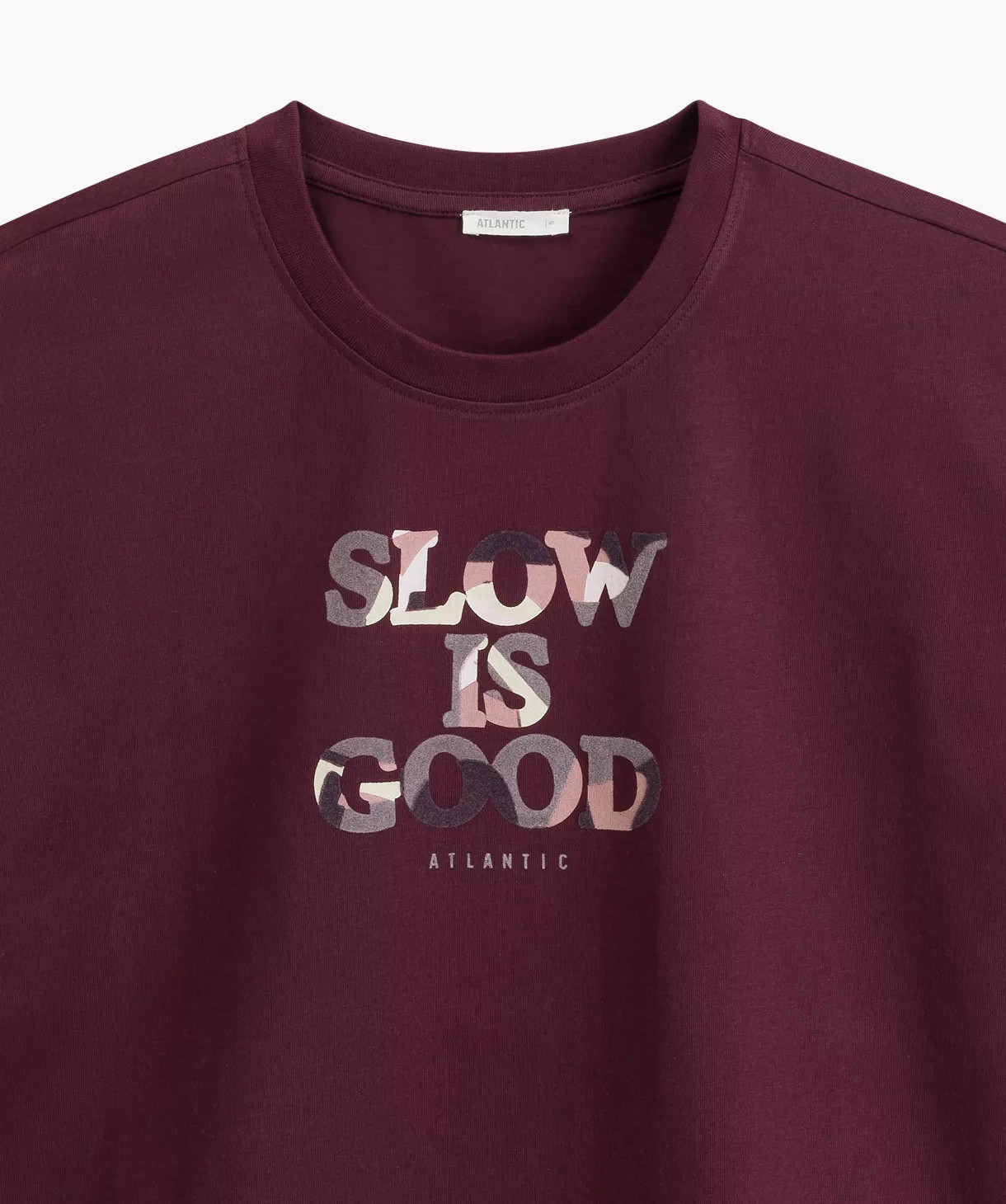 Piżama damska w głębokim odcieniu czerwonego wina, składająca się z luźnej bluzy oraz długich spodni, to doskonały wybór na jesienno-zimowe, chłodne noce. To także fantastyczny pomysł na prezent pod choinkę, zwłaszcza dla miłośniczki slow life’u. Bluza ma okrągłe wycięcie przy szyi, długie rękawy, wykończone ściągaczami i ozdobiona jest sporych rozmiarów napisem Slow is good. Spodnie mają delikatnie zwężające się ku dołowi nogawki (również wykończone ściągaczami) oraz praktyczne kieszenie po bokach.